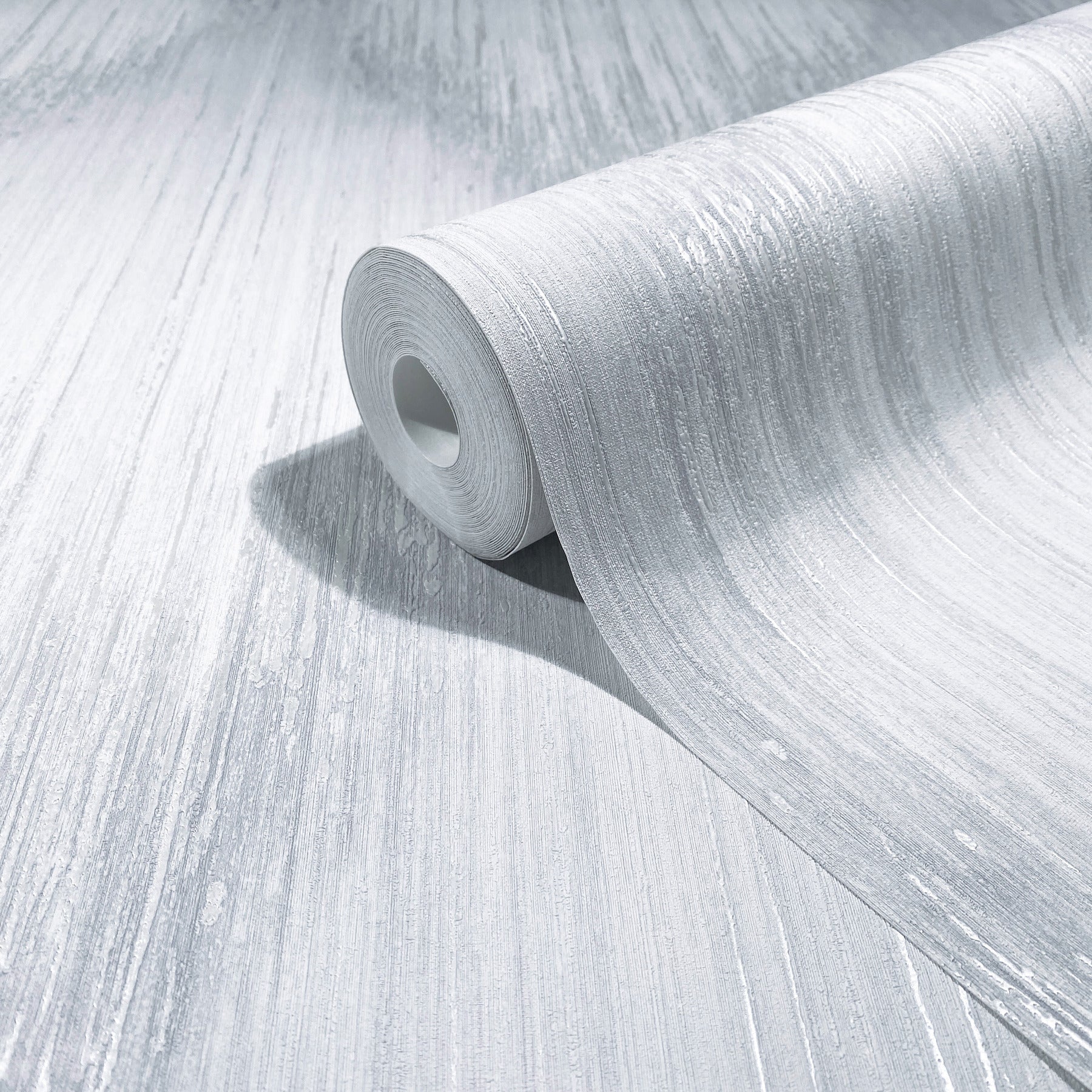 The artistic drama of pattern Starfall's ikat stylings is elevated by metallic accents in this large-scale diamond damask wallpaper. Seen here in ivory, light grey, and pale gold. Starfall is an unpasted, vinyl wallpaper measuring 27.6 inches wide by 33 feet long, covering approximately About 75.9 square feet square feet per roll.