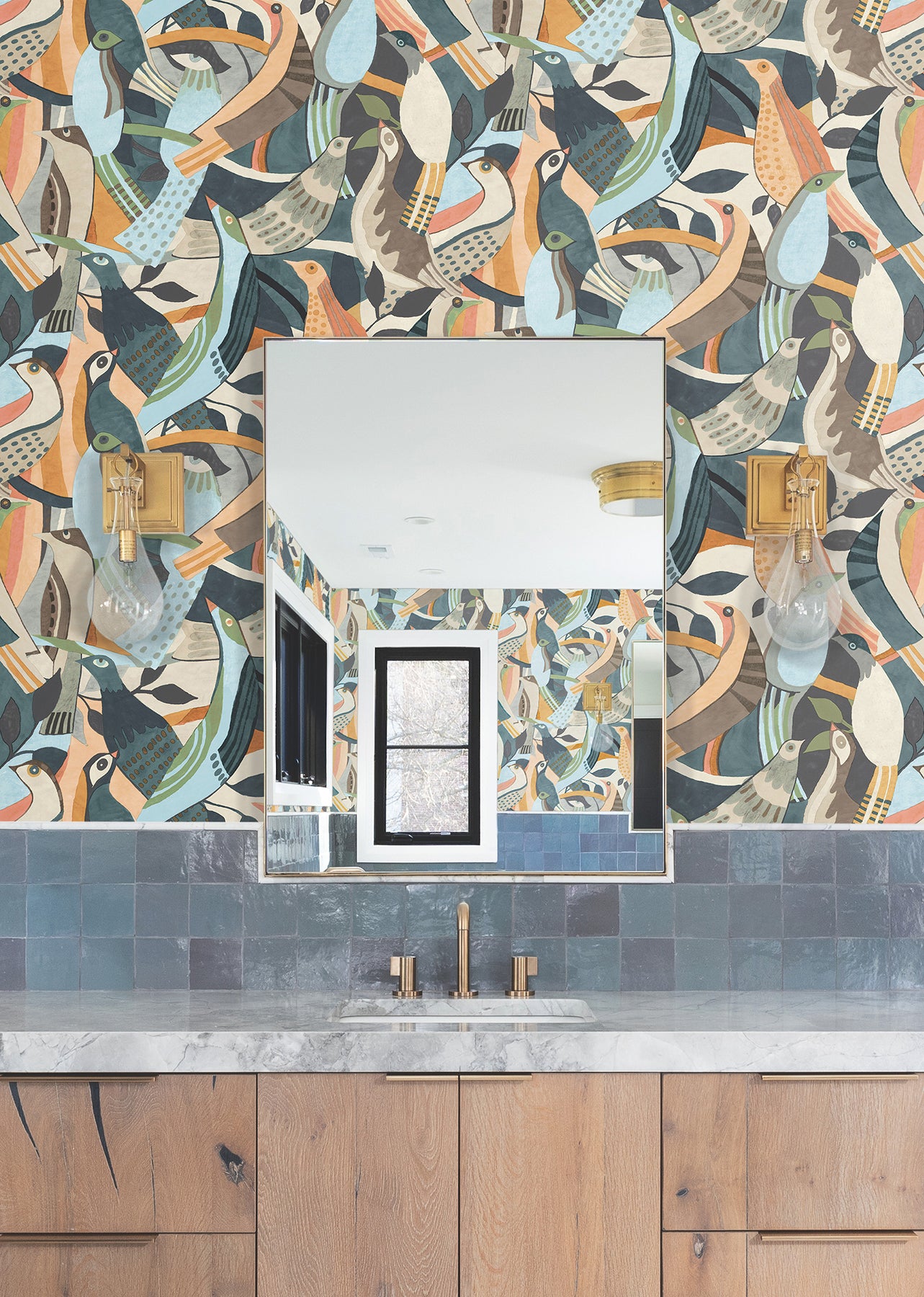 Indulge in a modern statement pattern with this impressionistic design featuring abstracted birds and greenery. Seen here in shades of blue, coral, light pink, green, brown, and terracotta. Fauvist Flock is a peel and stick, non woven wallpaper measuring 27 inches wide by 20 feet long, covering approximately 45 square feet per roll.