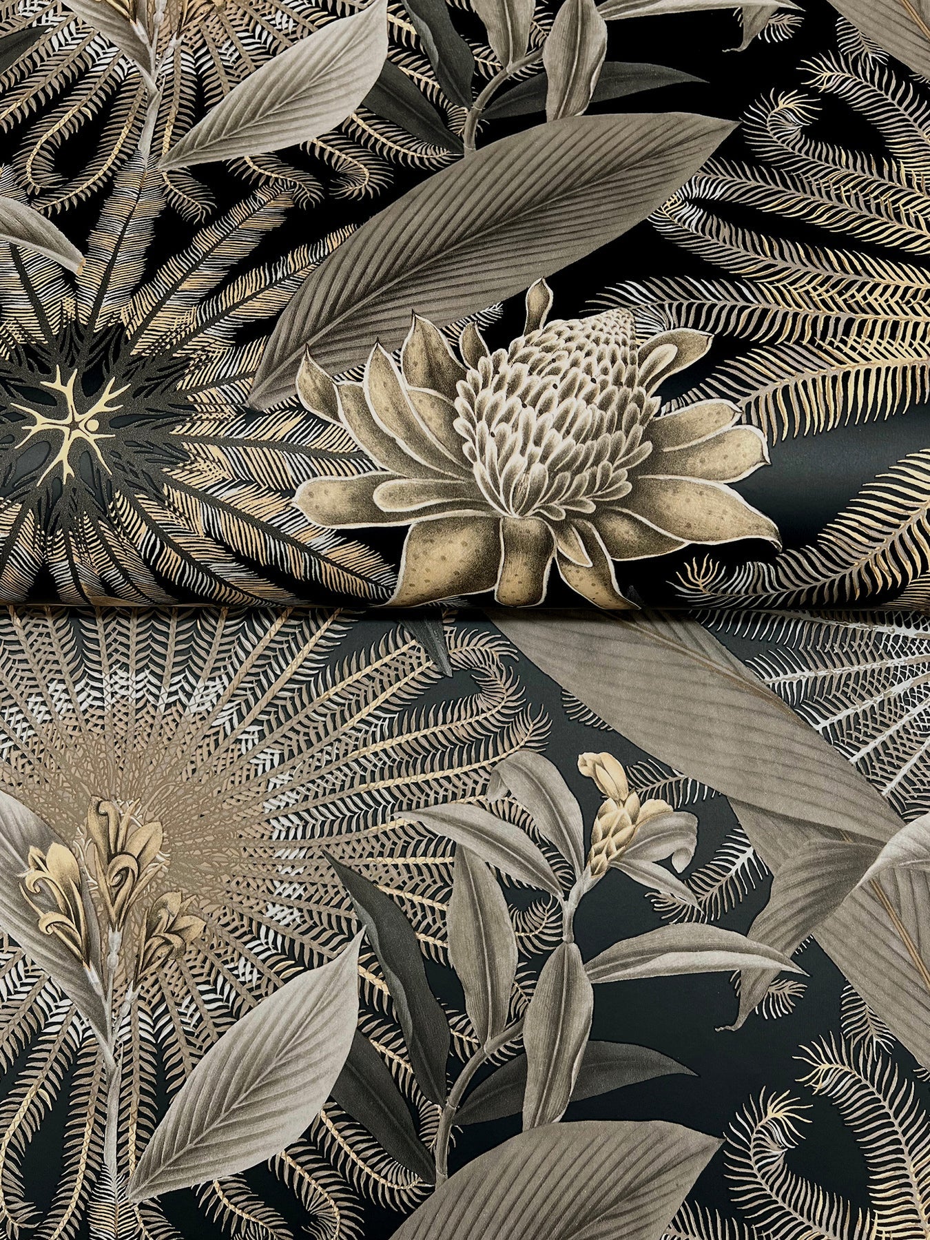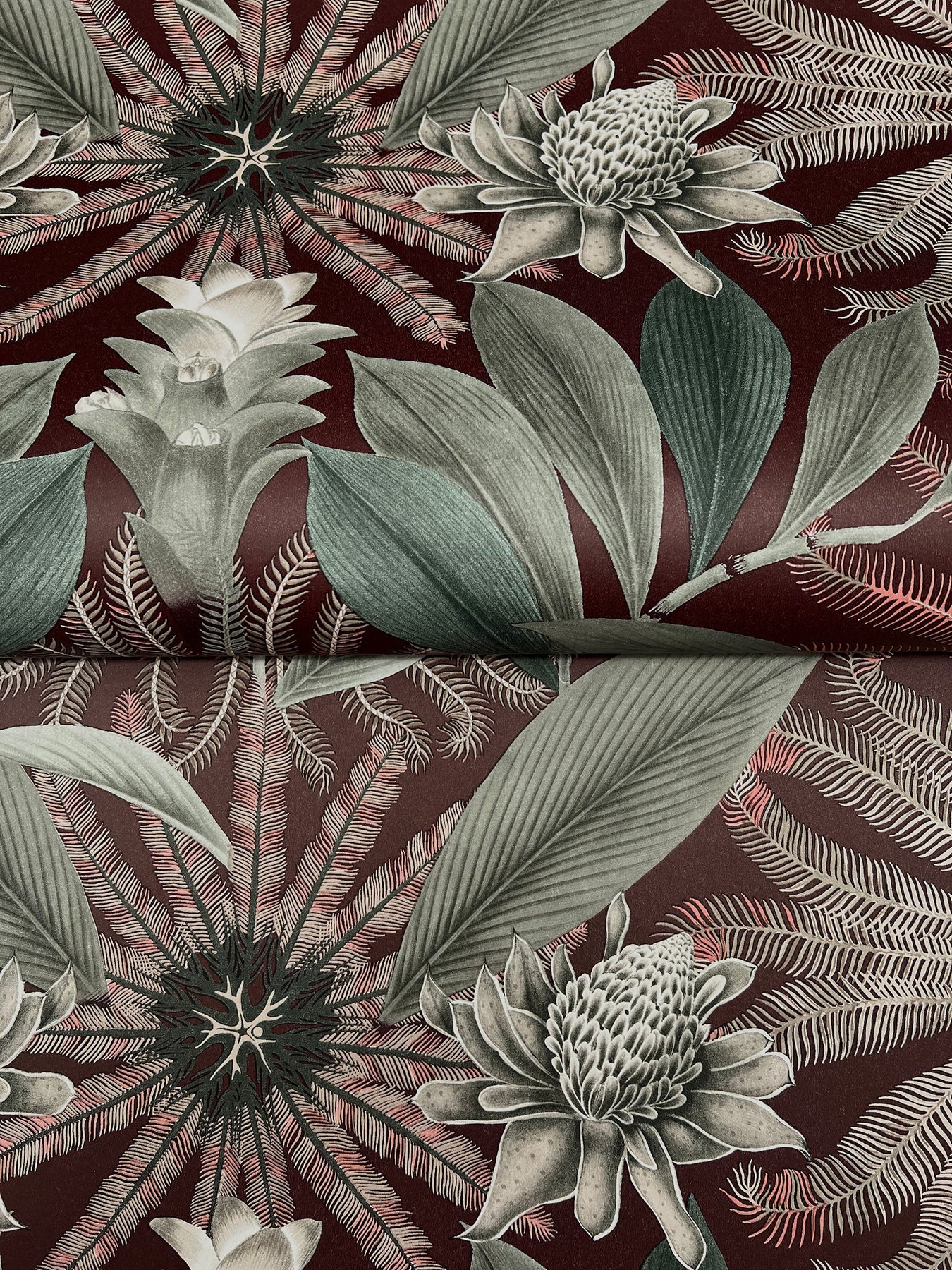 Extravagant Enchanted Garden features a variety of lush, tropical florals framed by oblong leaves and rounds of fanning ferns. Seen here in coral, pink, beige, white, and soft greens against maroon. Enchanted Garden is an unpasted, non woven wallpaper measuring 27 inches wide by 27 feet long, covering approximately About 60.8 square feet square feet per roll.
