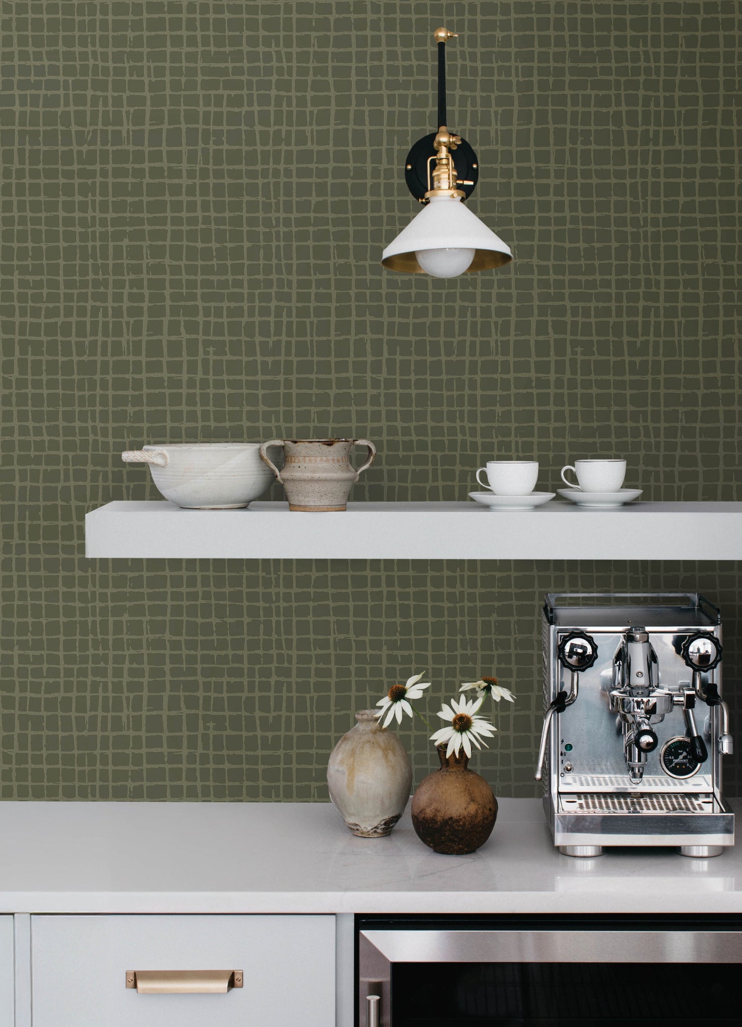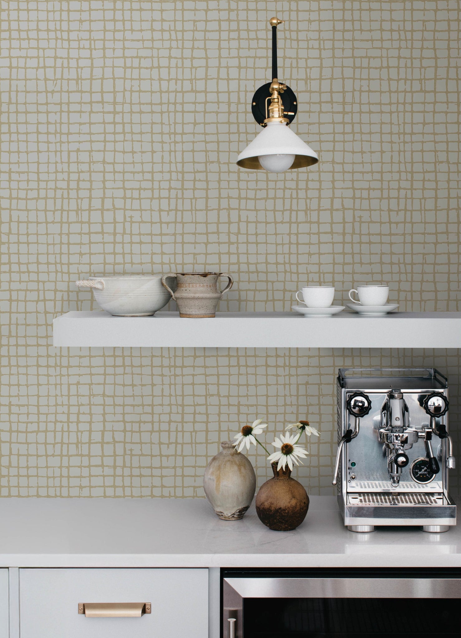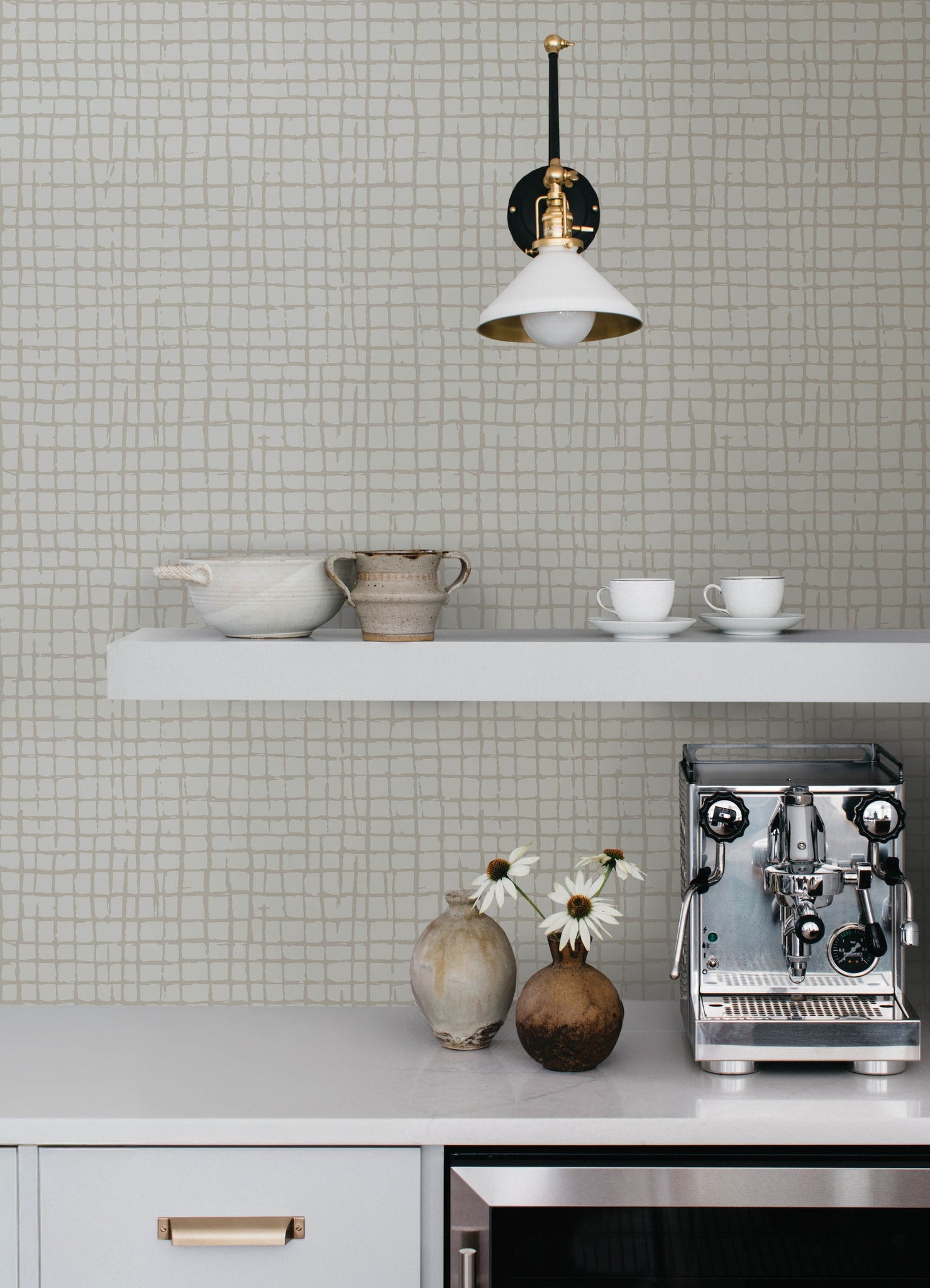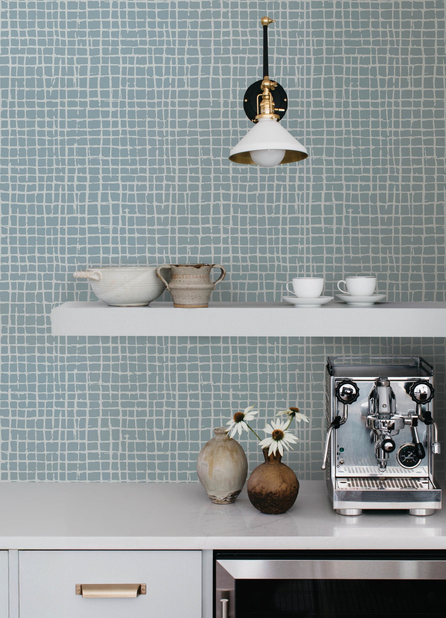 The hand-drawn netting of Albin offers modern dimension elevated by tactile detailing. Featured here with pale grey linework against robin's egg blue. Albin is an unpasted, non woven wallpaper measuring 20.5 inches wide by 33 feet long, covering approximately About 56.4 square feet square feet per roll.