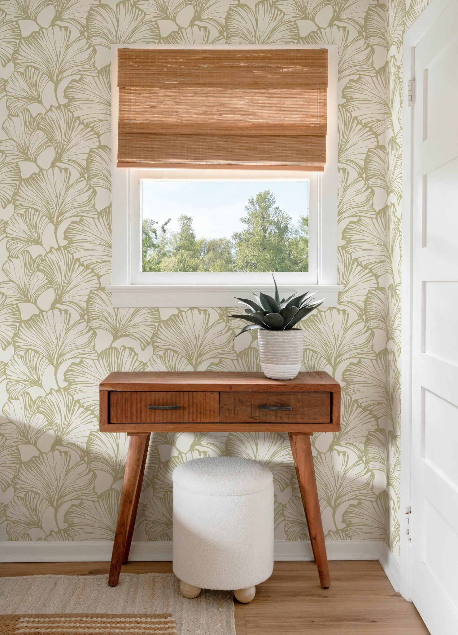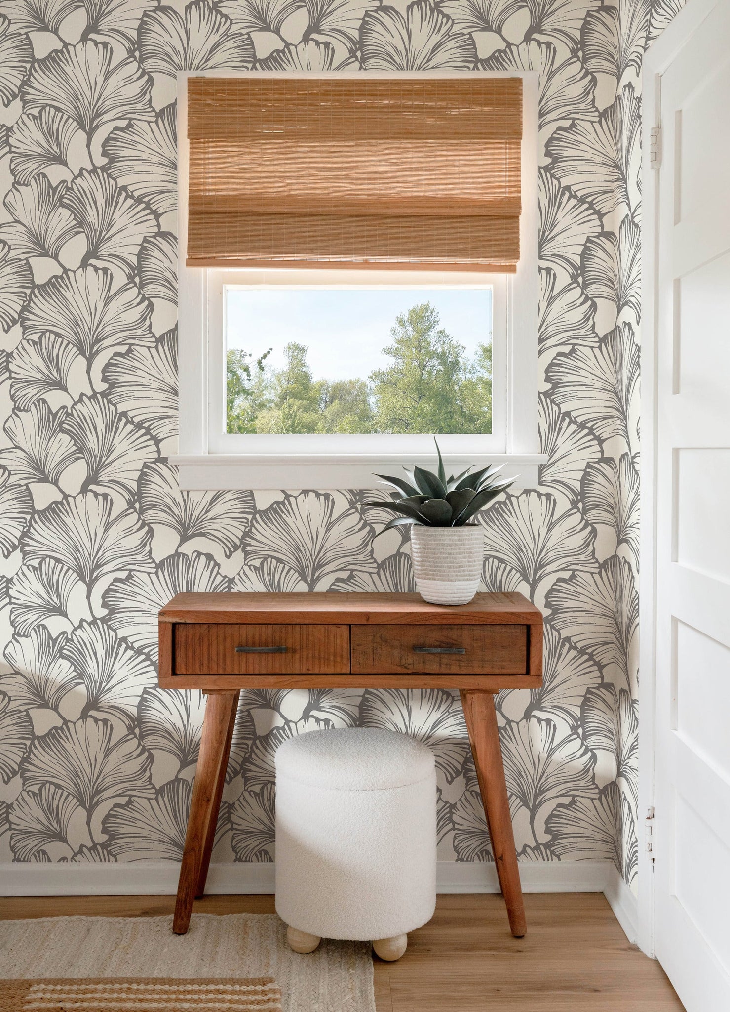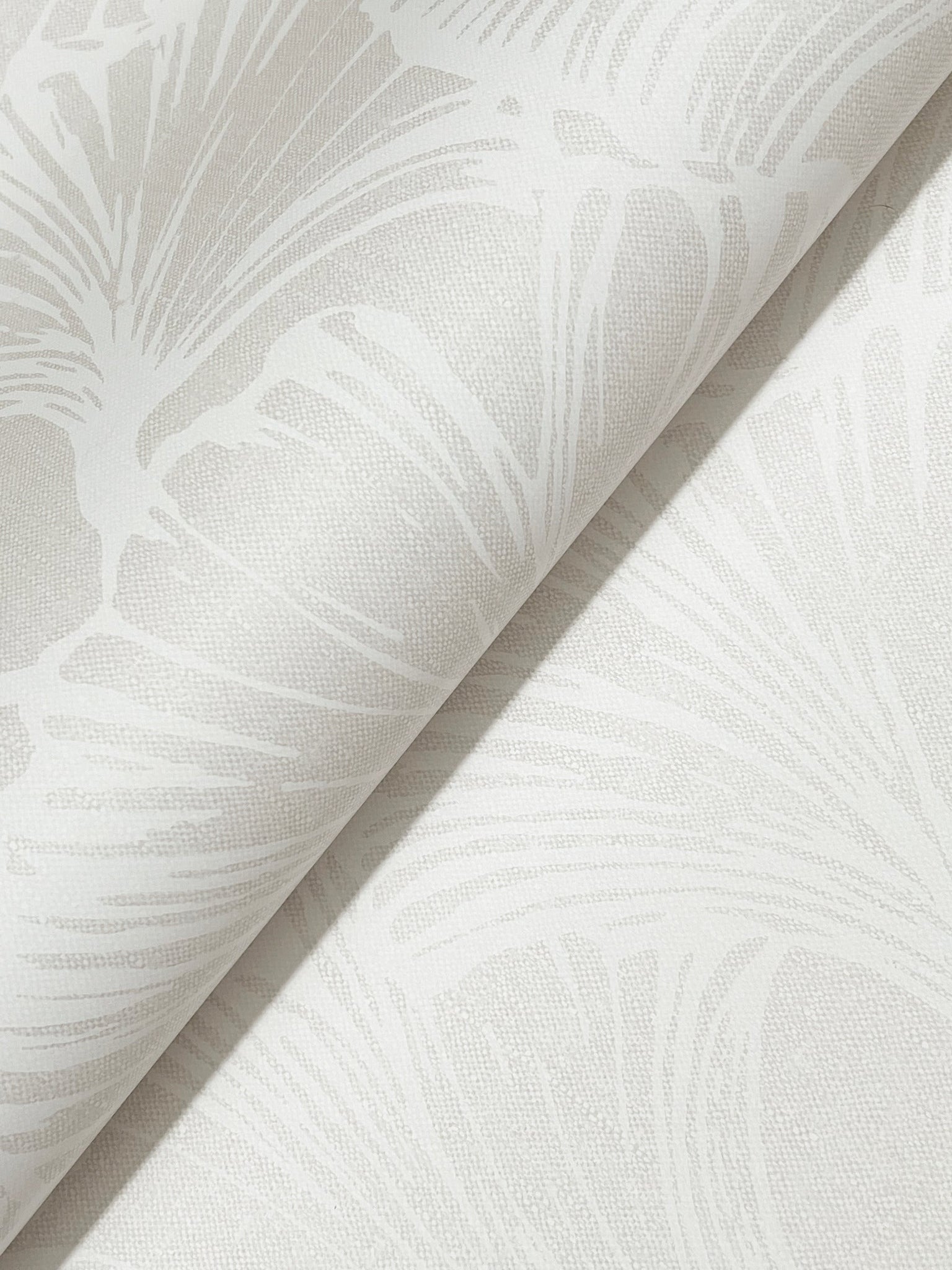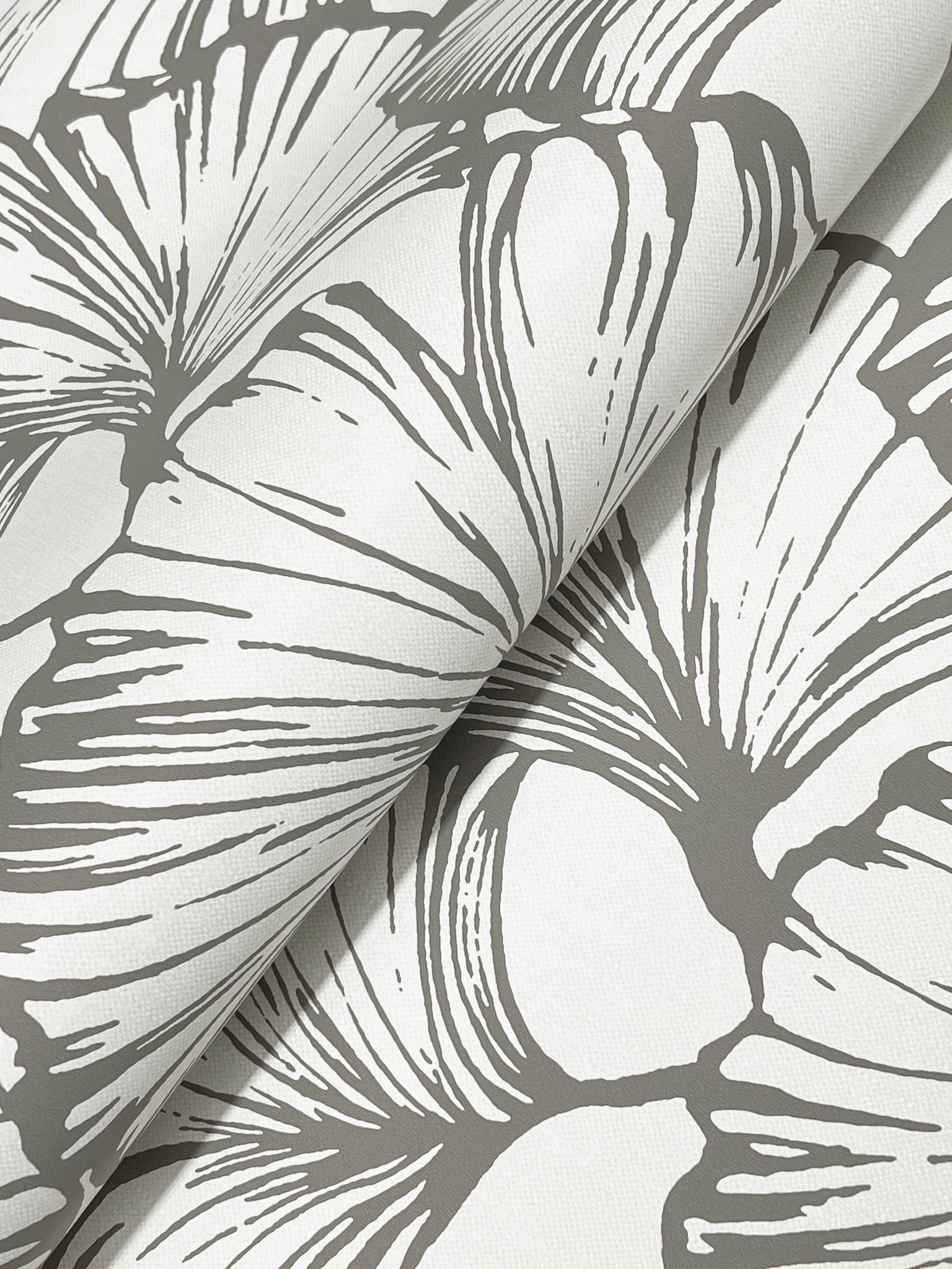 Kyoto’s artful, overlapping ginkgo leaf outlines give the illusion of actively drifting through the air. Seen here inked in white against pale grey. Kyoto is an unpasted, non woven wallpaper measuring 20.5 inches wide by 33 feet long, covering approximately About 56.4 square feet square feet per roll.
