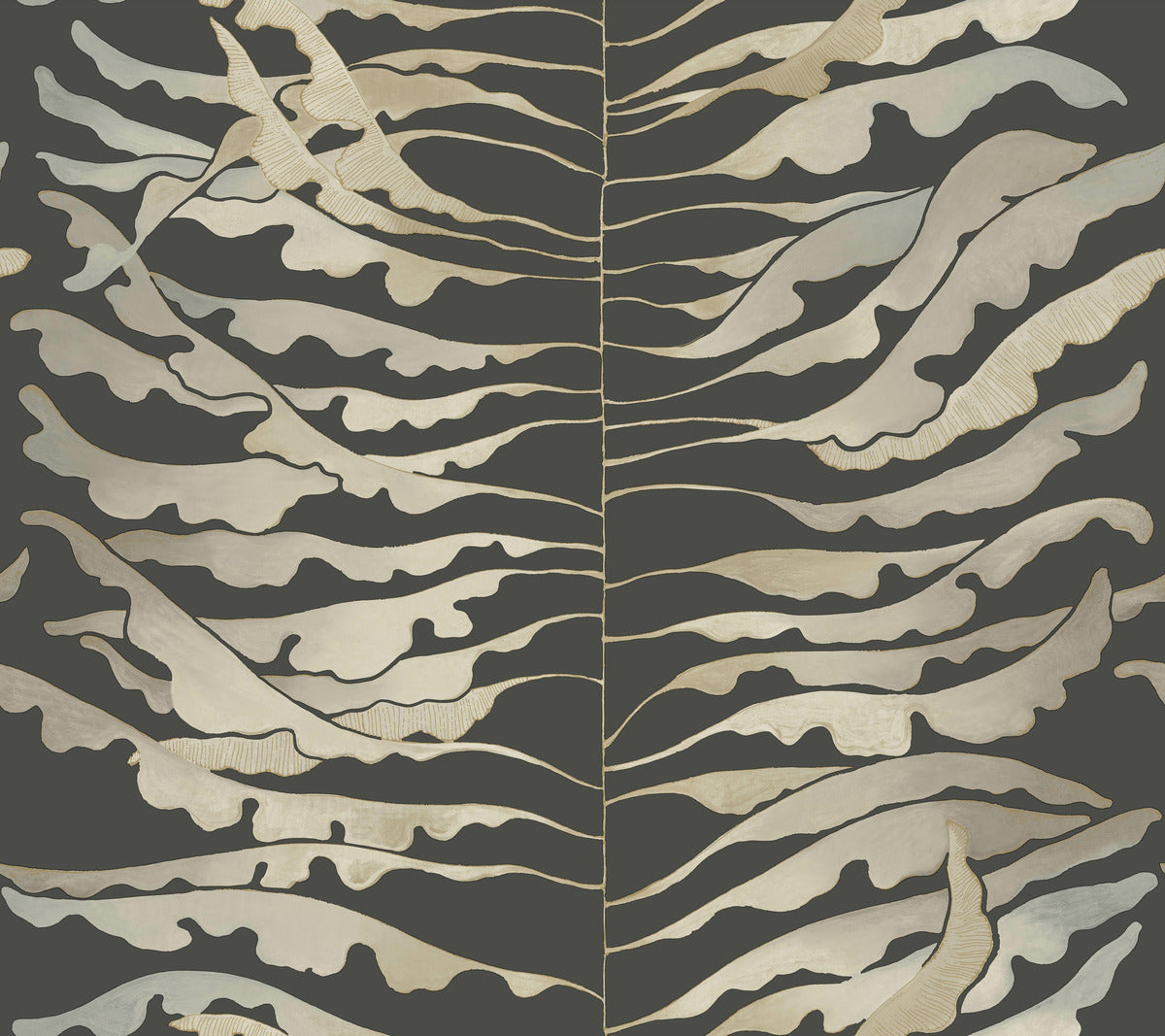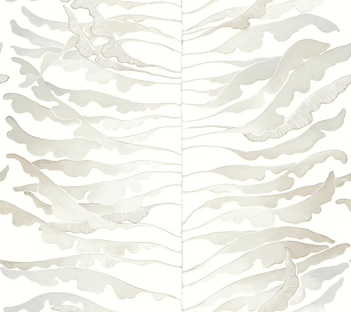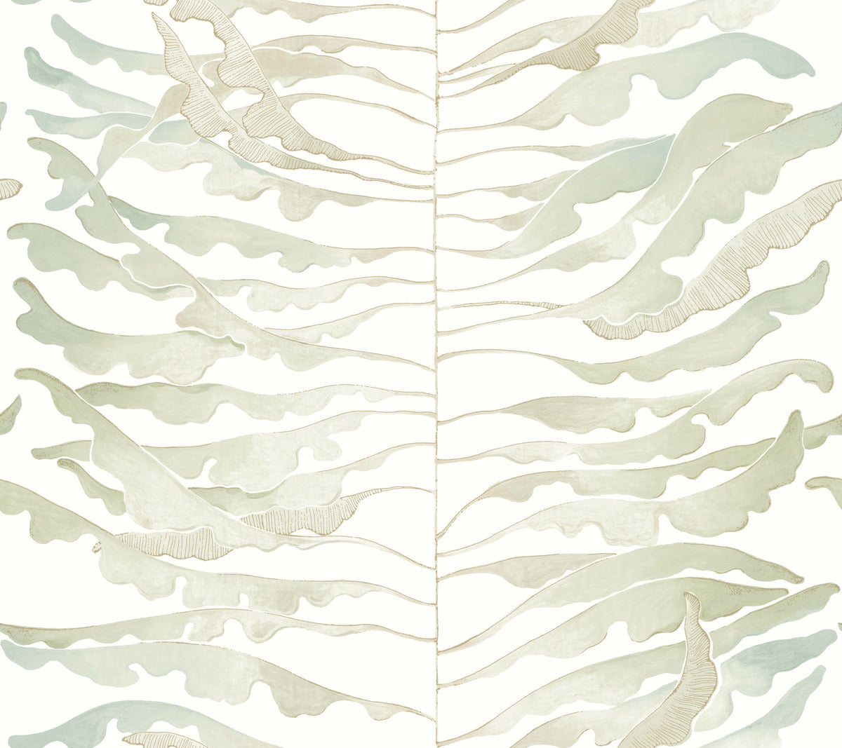 An organic take on striped accents, Leaf Column's illustrative design features thin, curling fronds watercolored in shades of taupe, pale grey, and rose along a central connective stem embellished with golden highlights. This Leaf Column Wallpaper measures approximately 27 inches wide by 27 feet long, measuring approximately 60.8 square feet per roll. Textural, organic forms grounded in earthly inspiration.