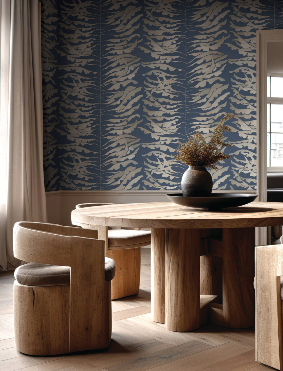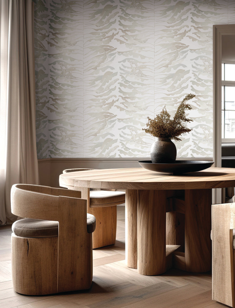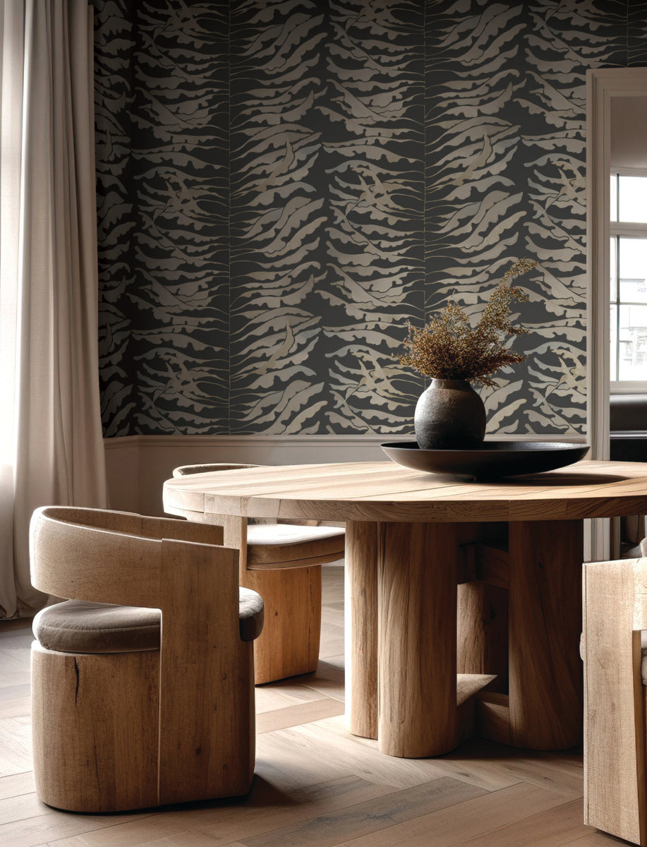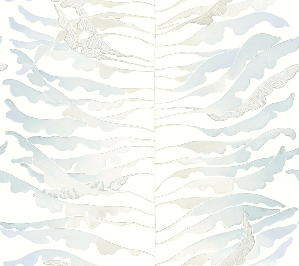 An organic take on striped accents, Leaf Column's illustrative design features thin, curling fronds watercolored in shades of taupe, pale grey, and rose along a central connective stem embellished with golden highlights. This Leaf Column Wallpaper measures approximately 27 inches wide by 27 feet long, measuring approximately 60.8 square feet per roll. Textural, organic forms grounded in earthly inspiration.