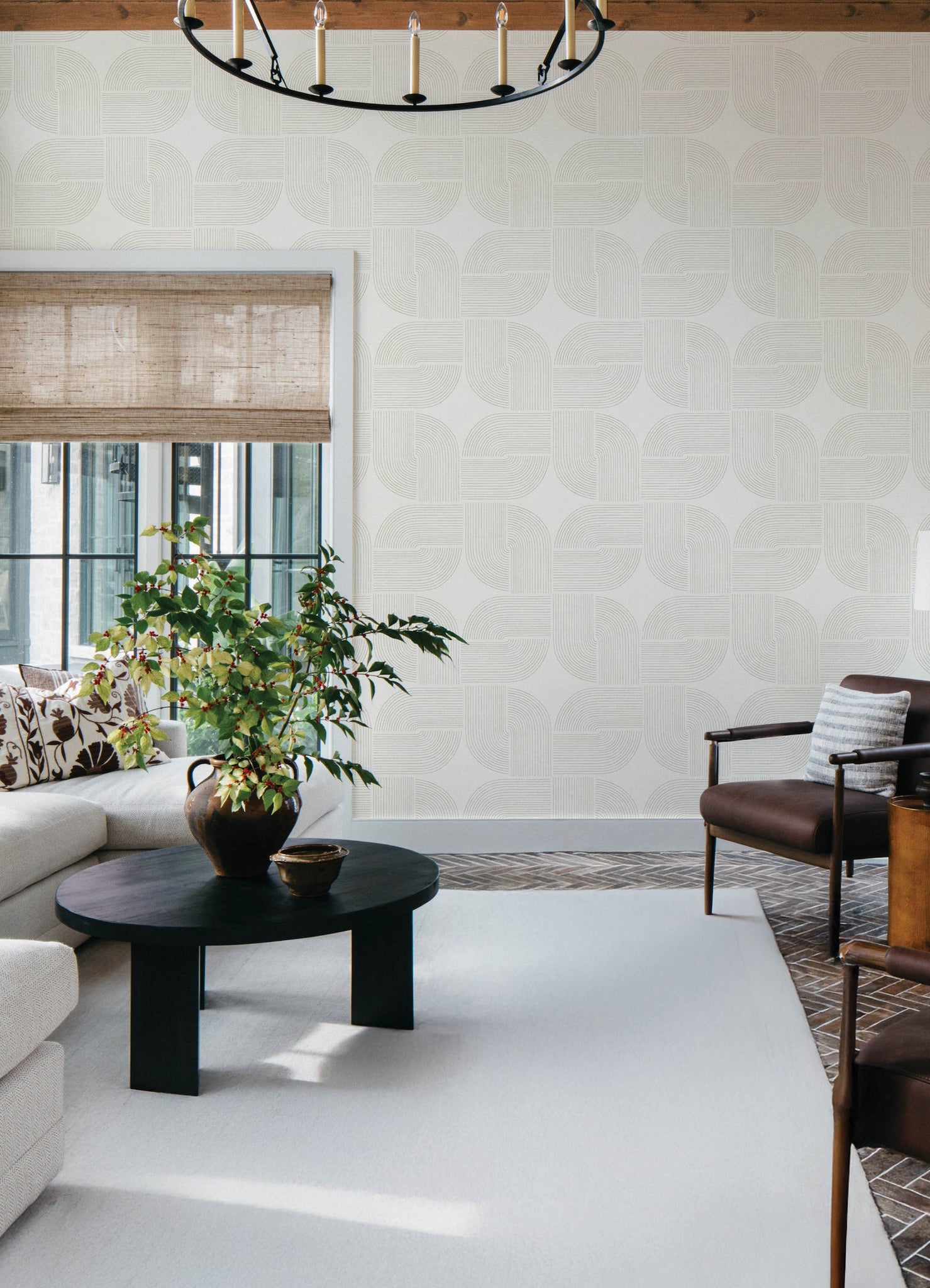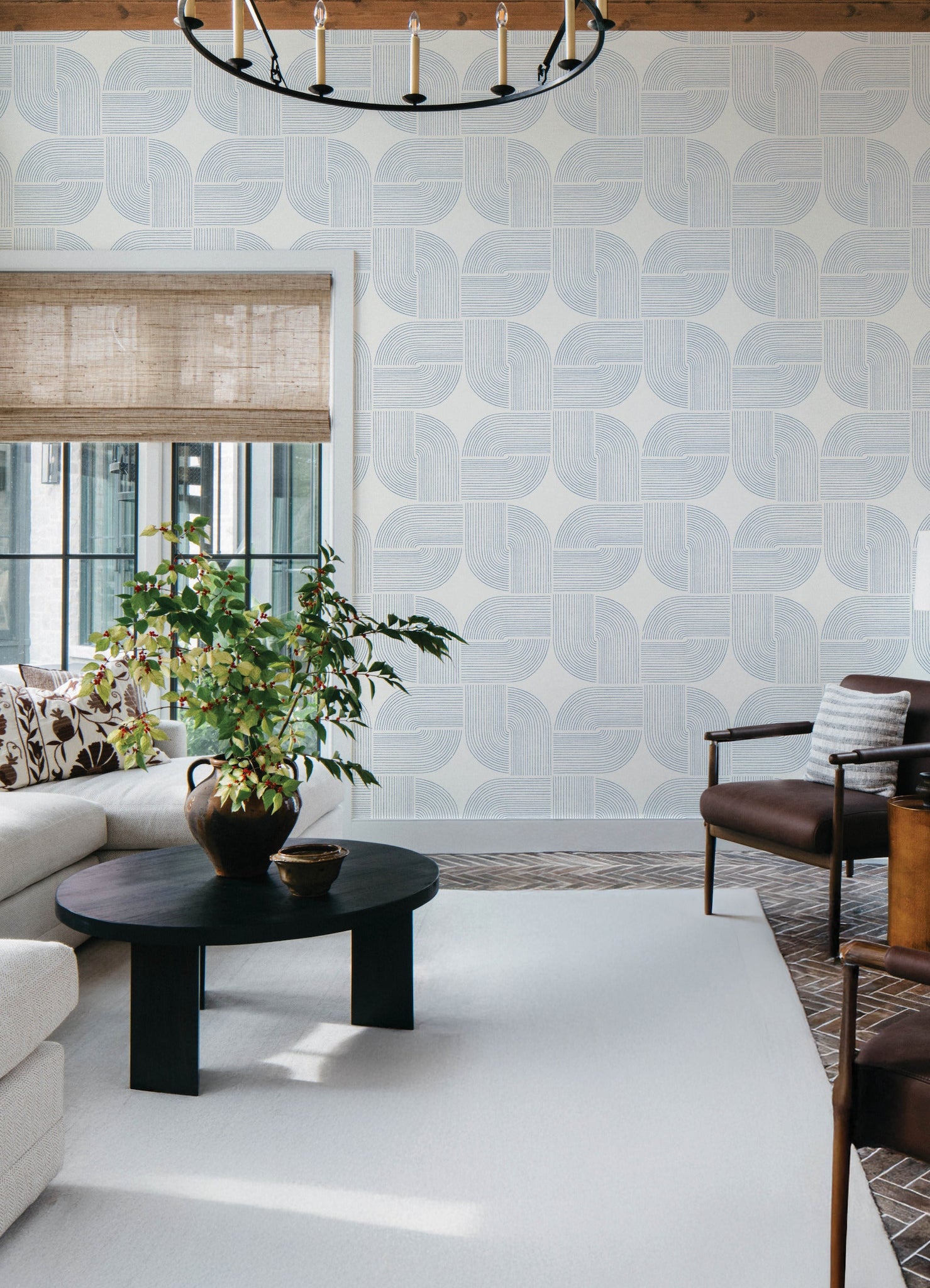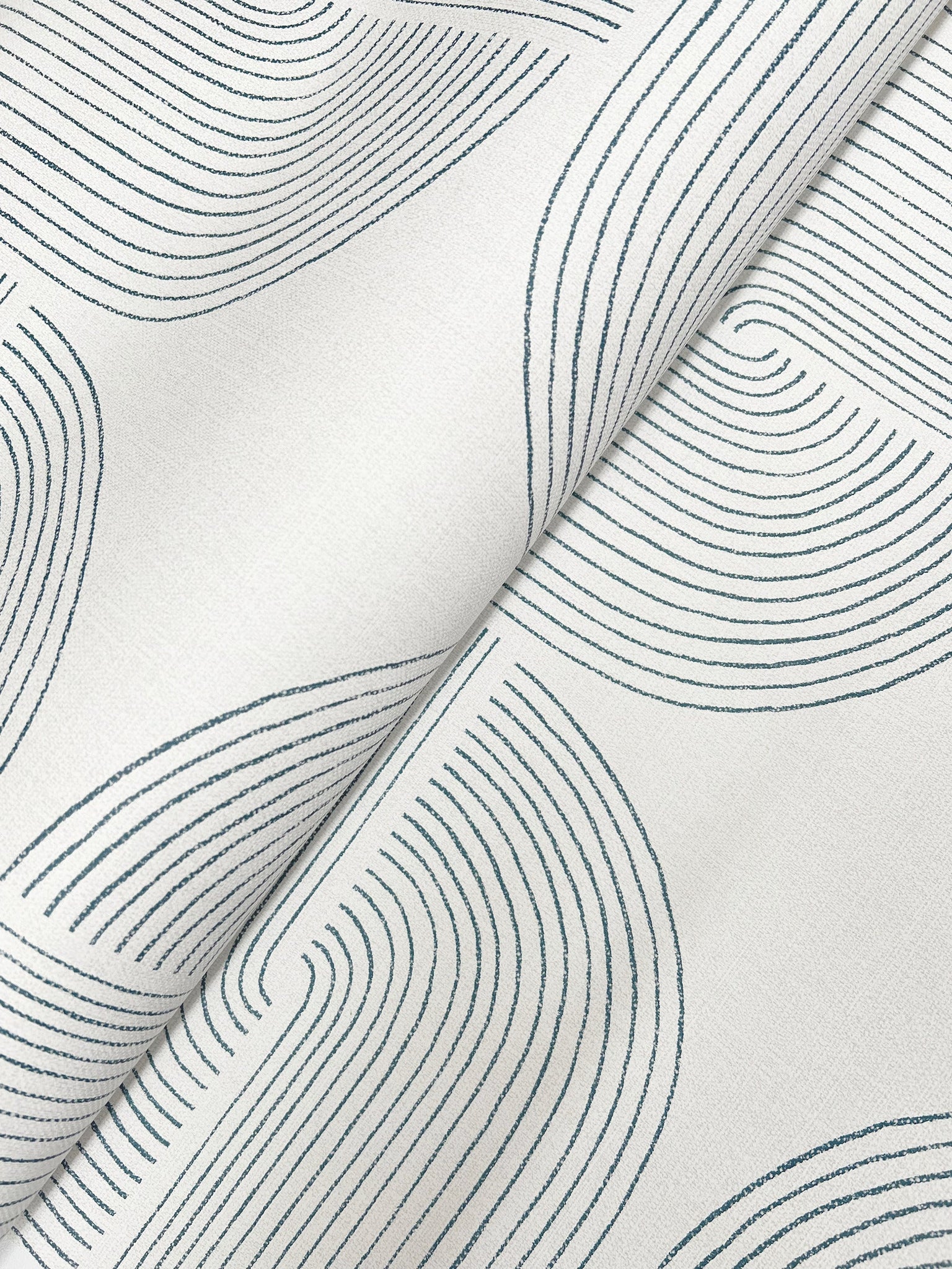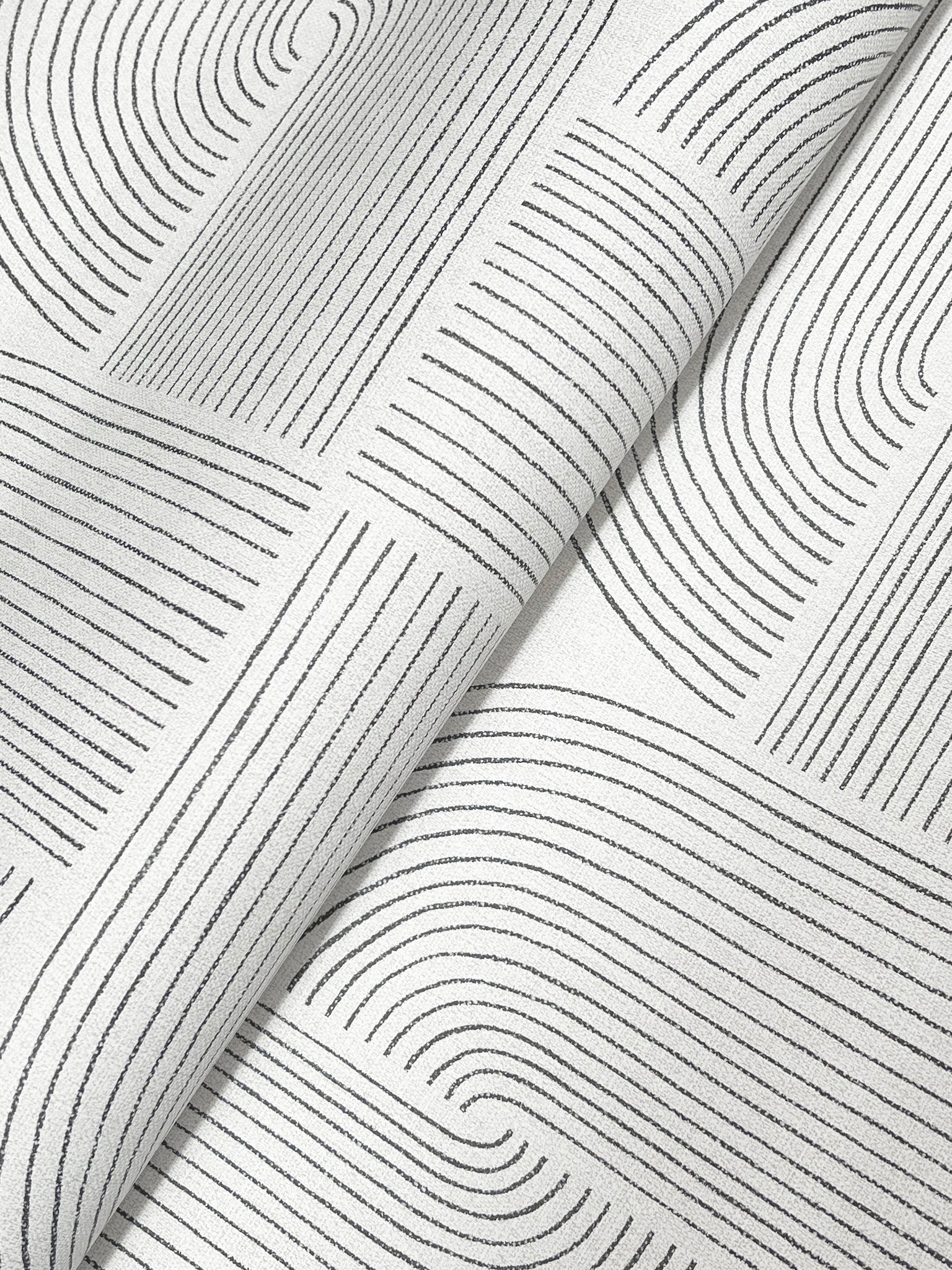 The culmination of linear arches and the stars formed at their center lends Savoye retro flair and lived-in elegance. Featured here with dark blue linework against light grey. Savoye is an unpasted, non woven wallpaper measuring 20.5 inches wide by 33 feet long, covering approximately About 56.4 square feet square feet per roll.