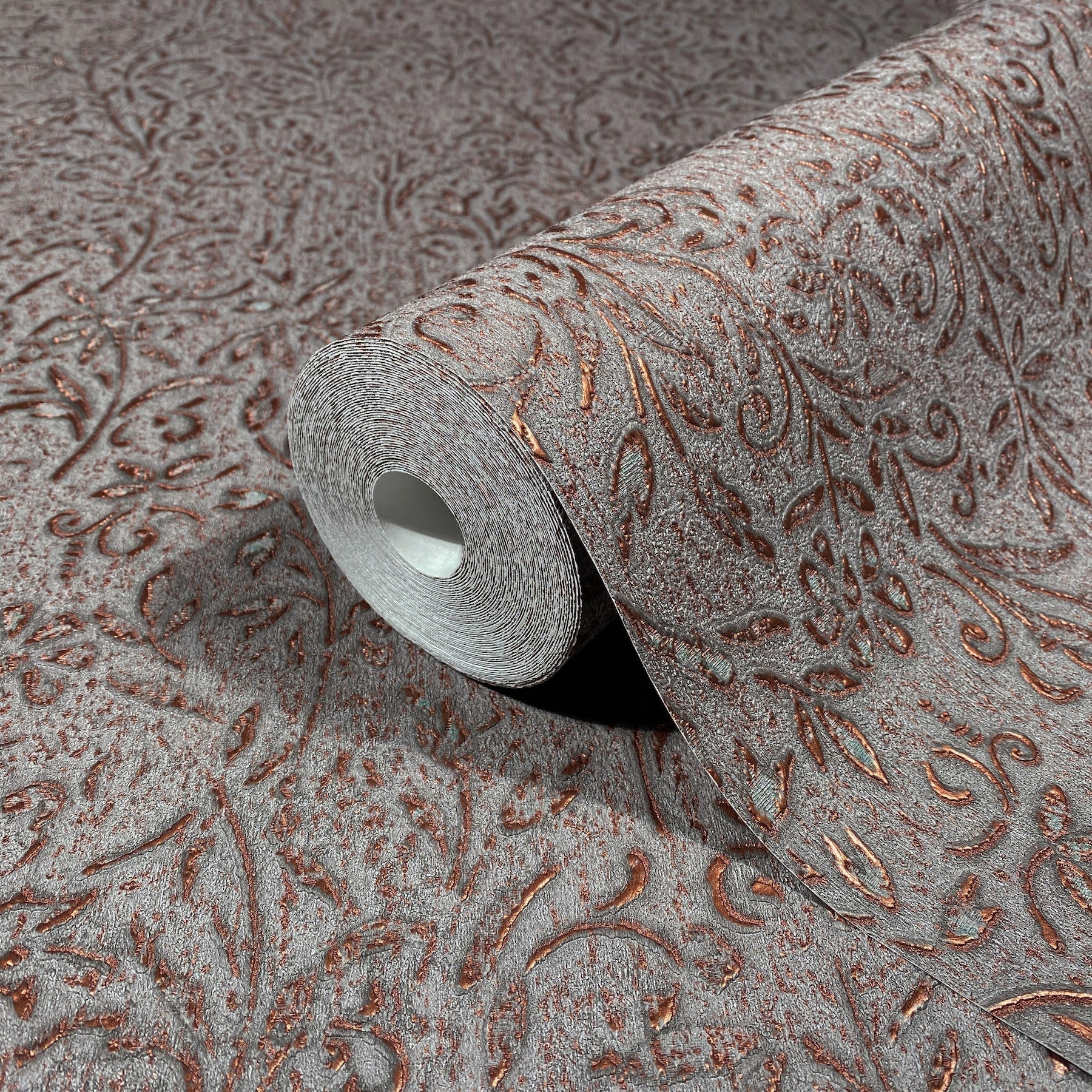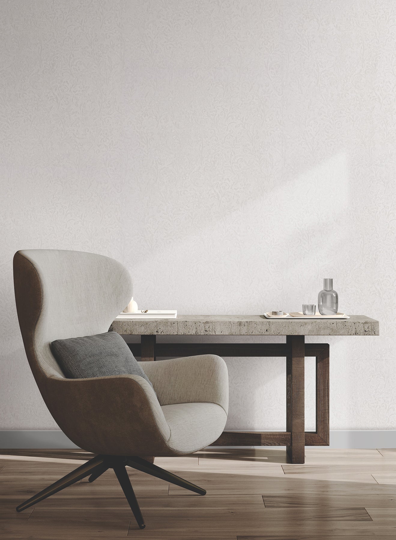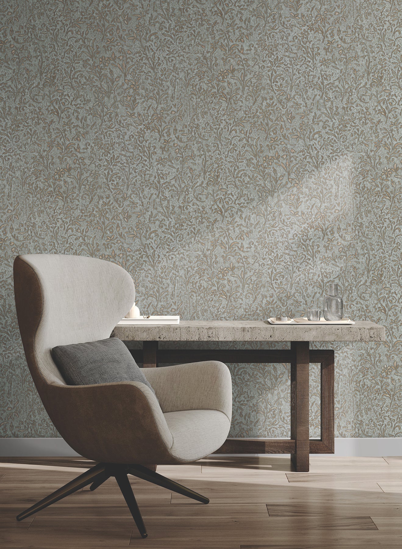 Sculpted Floral's carved filigree features delicate flowers and scrolled embellishments along a textured backdrop. Seen here with pearlescent aqua detailing along a pale grey background. Sculpted Floral is an unpasted, vinyl wallpaper measuring 20.9 inches wide by 33 feet long, covering approximately About 57.5 square feet square feet per roll.