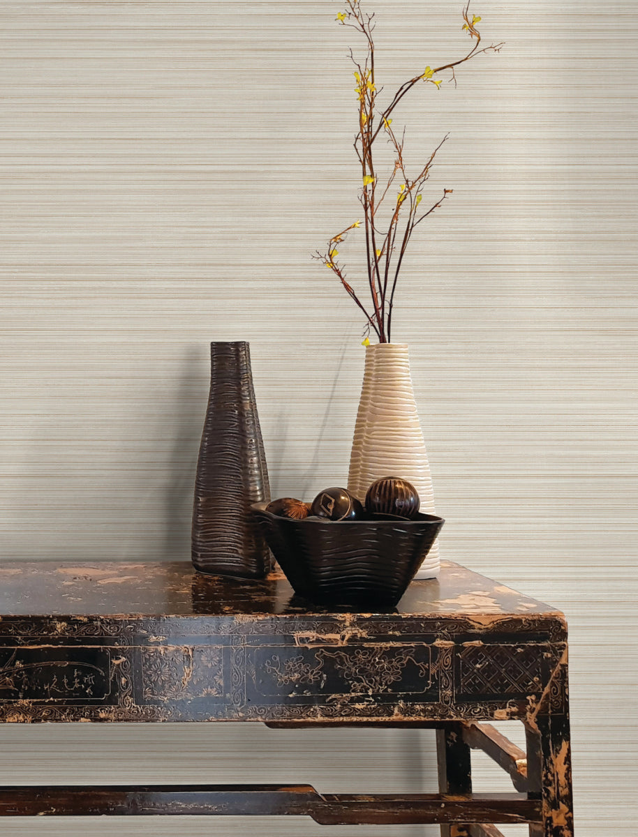 Classic stripes are elevated with intricate raised linework and a restricted color palette of green, beige, and cream. This Alignment Wallpaper measures approximately 27 inches wide by 27 feet long, measuring approximately 60.8 square feet per roll. Textural, organic forms grounded in earthly inspiration.