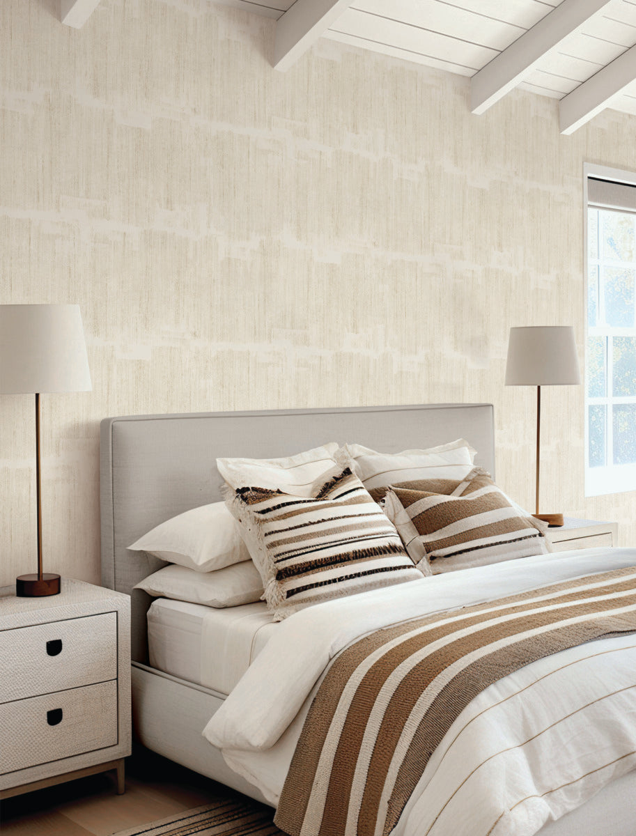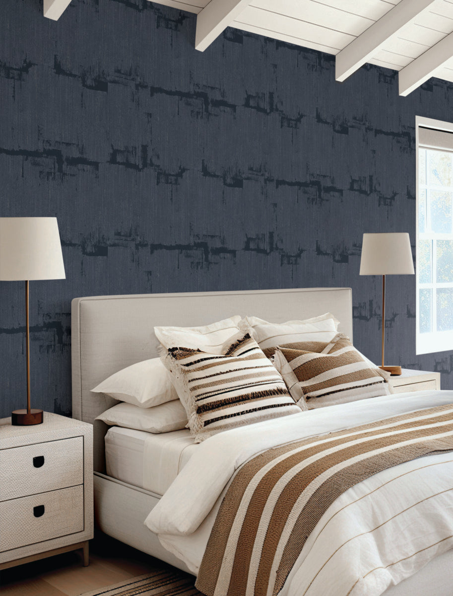 Rhythm & Rhyme's abstract stripe design features large, staggered blocks embellished with textured striations, the midnight blue and indigo palette imbued with metallic luster. This Rhythm & Rhyme Wallpaper measures approximately 27 inches wide by 27 feet long, measuring approximately 60.8 square feet per roll. Textural, organic forms grounded in earthly inspiration.
