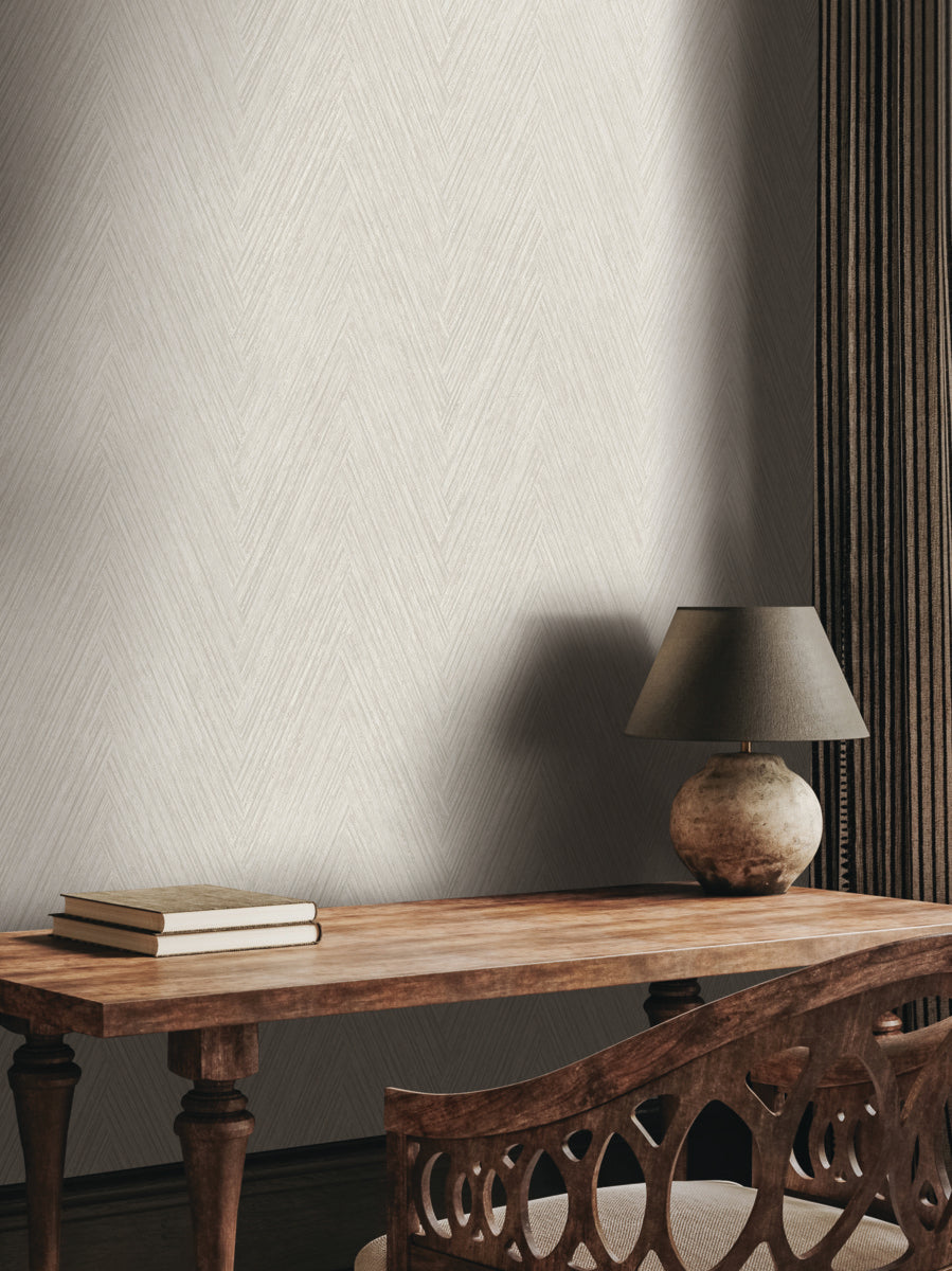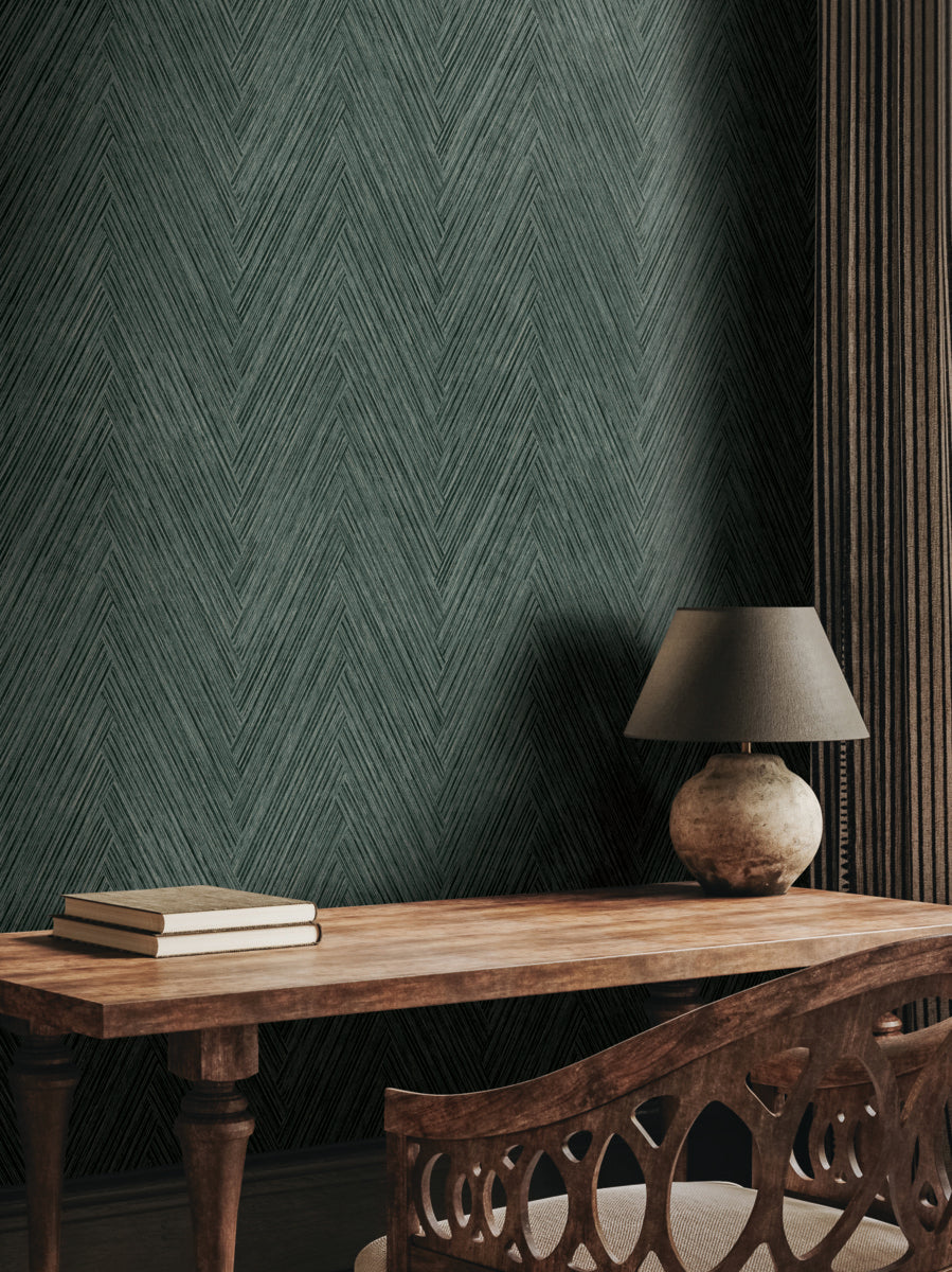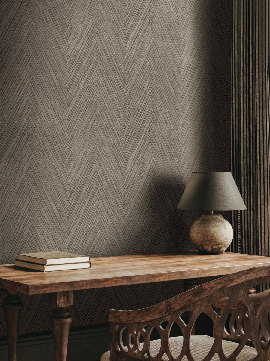 Thatched Herringbone adds extra embellishment to this classic, interlaced pattern with brushes of metallic gold and woven detailing inked in black and charcoal grey. This Thatched Chevron Wallpaper measures approximately 27 inches wide by 27 feet long, measuring approximately 60.8 square feet per roll. Textural, organic forms grounded in earthly inspiration.