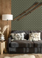 A diamond grid frames two styles of angular, western medallions in this two-tone design. The pattern is seemingly stitched in grey onto the black background, adding to the illusion of a well-worn throw blanket. Camp Blanket is a prepasted, non woven wallpaper measuring 20.5 inches wide by 33 feet long, covering approximately About 56.4 square feet square feet per roll.