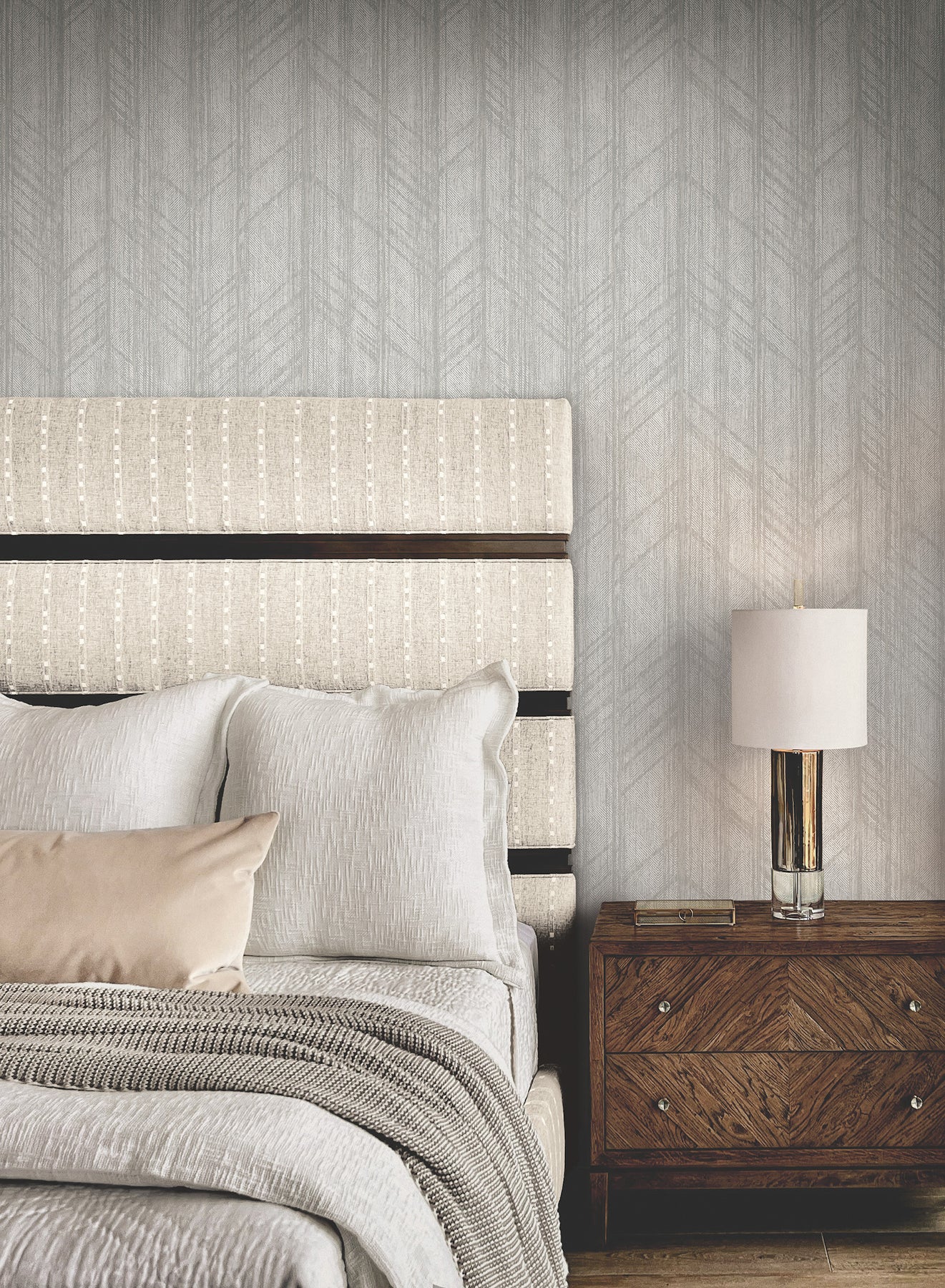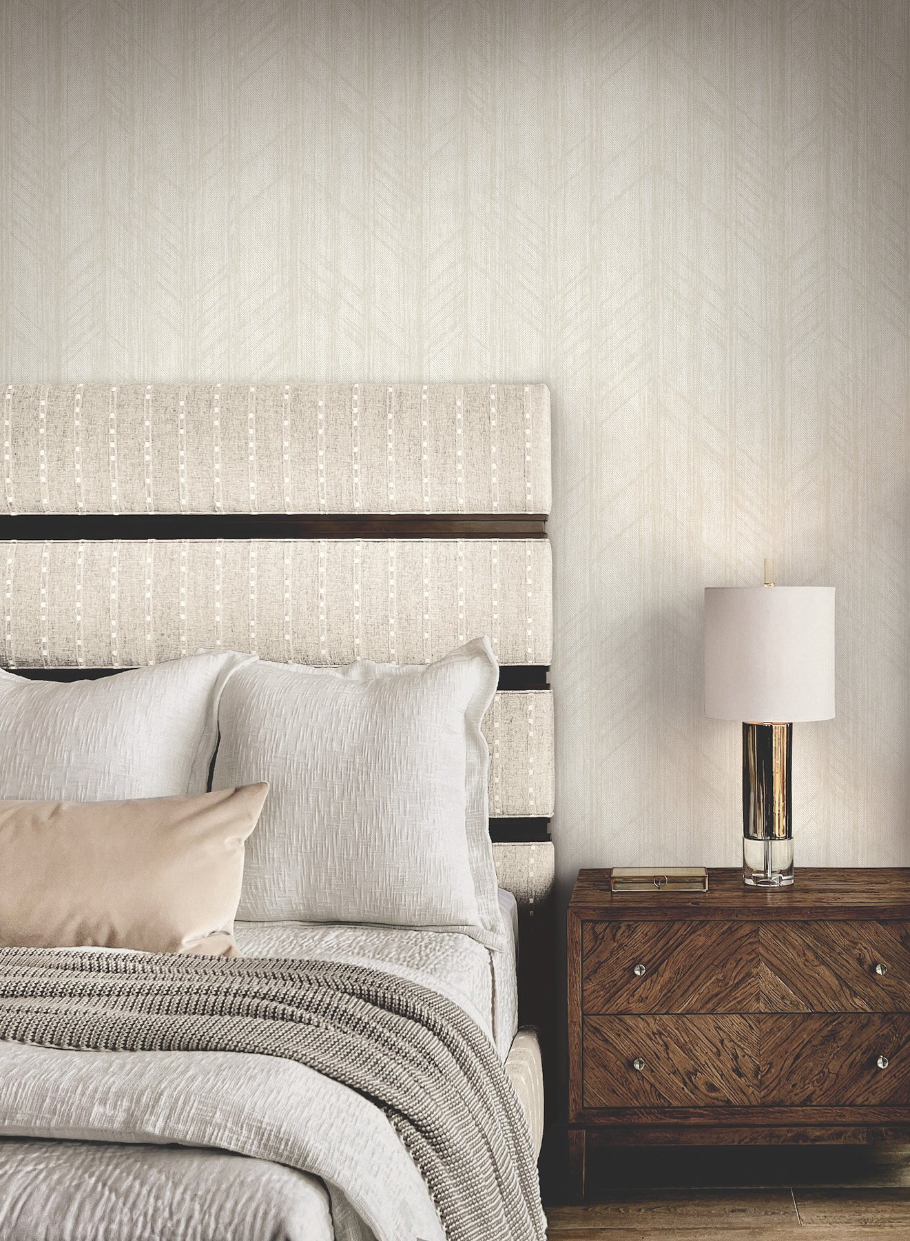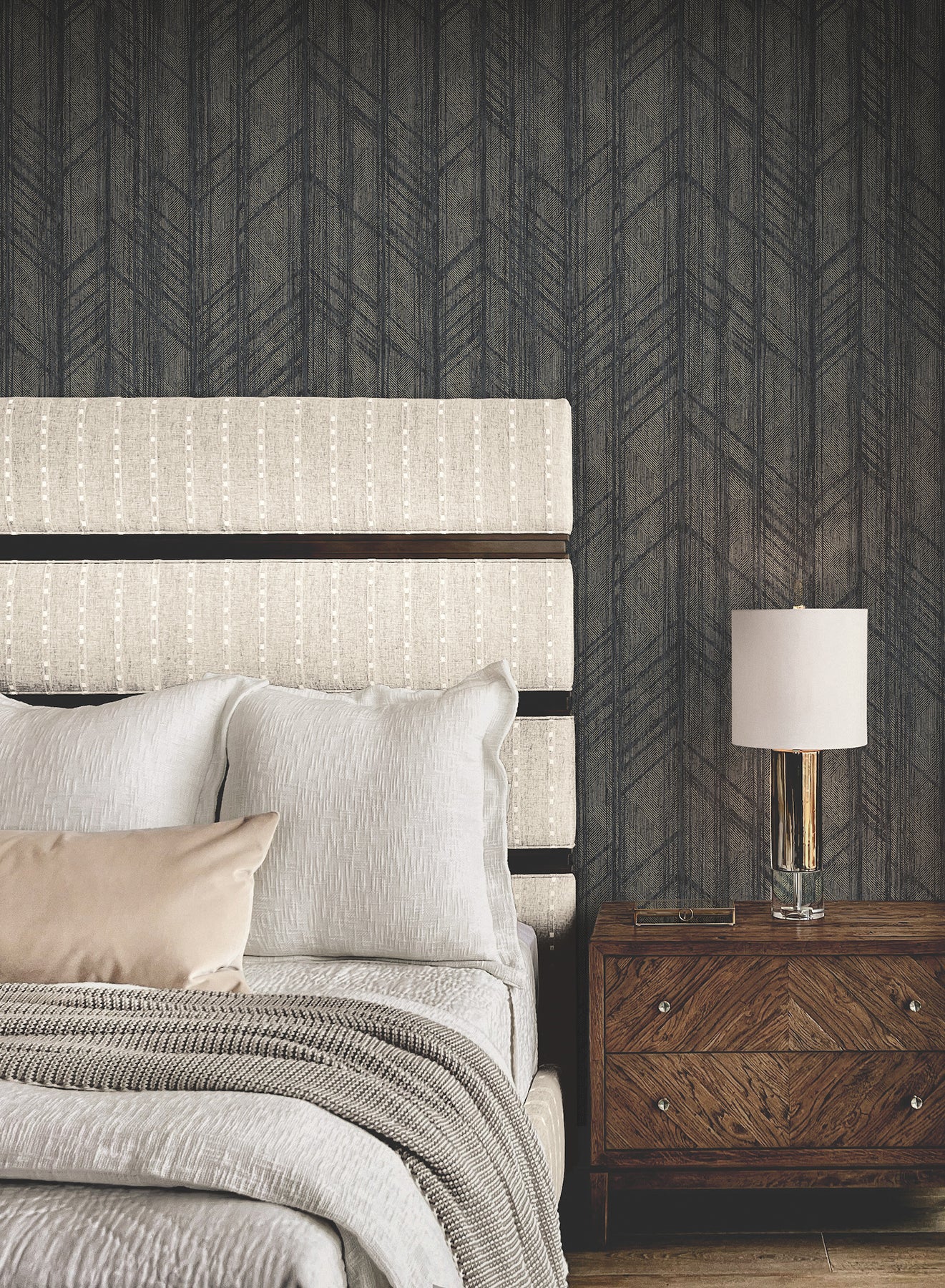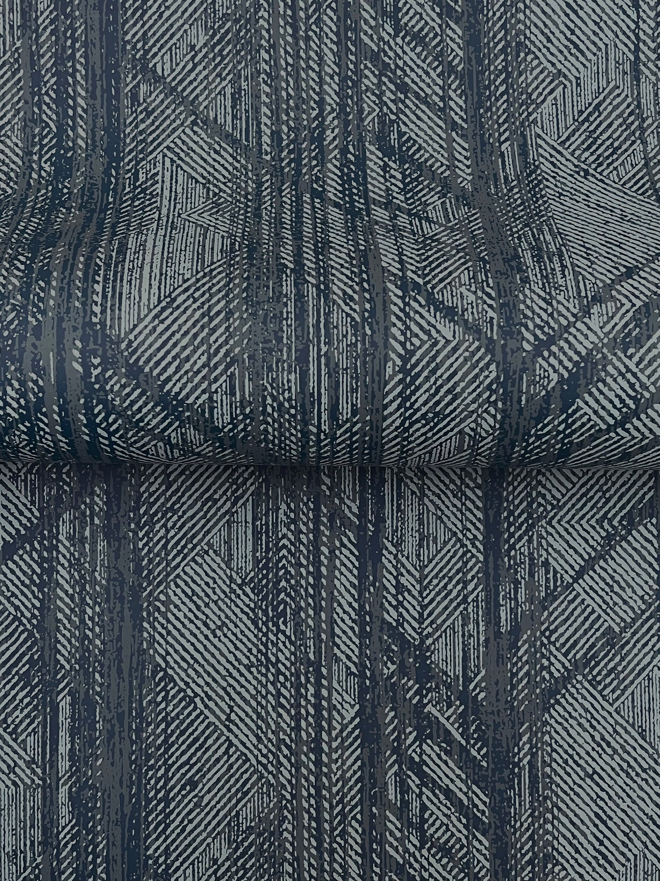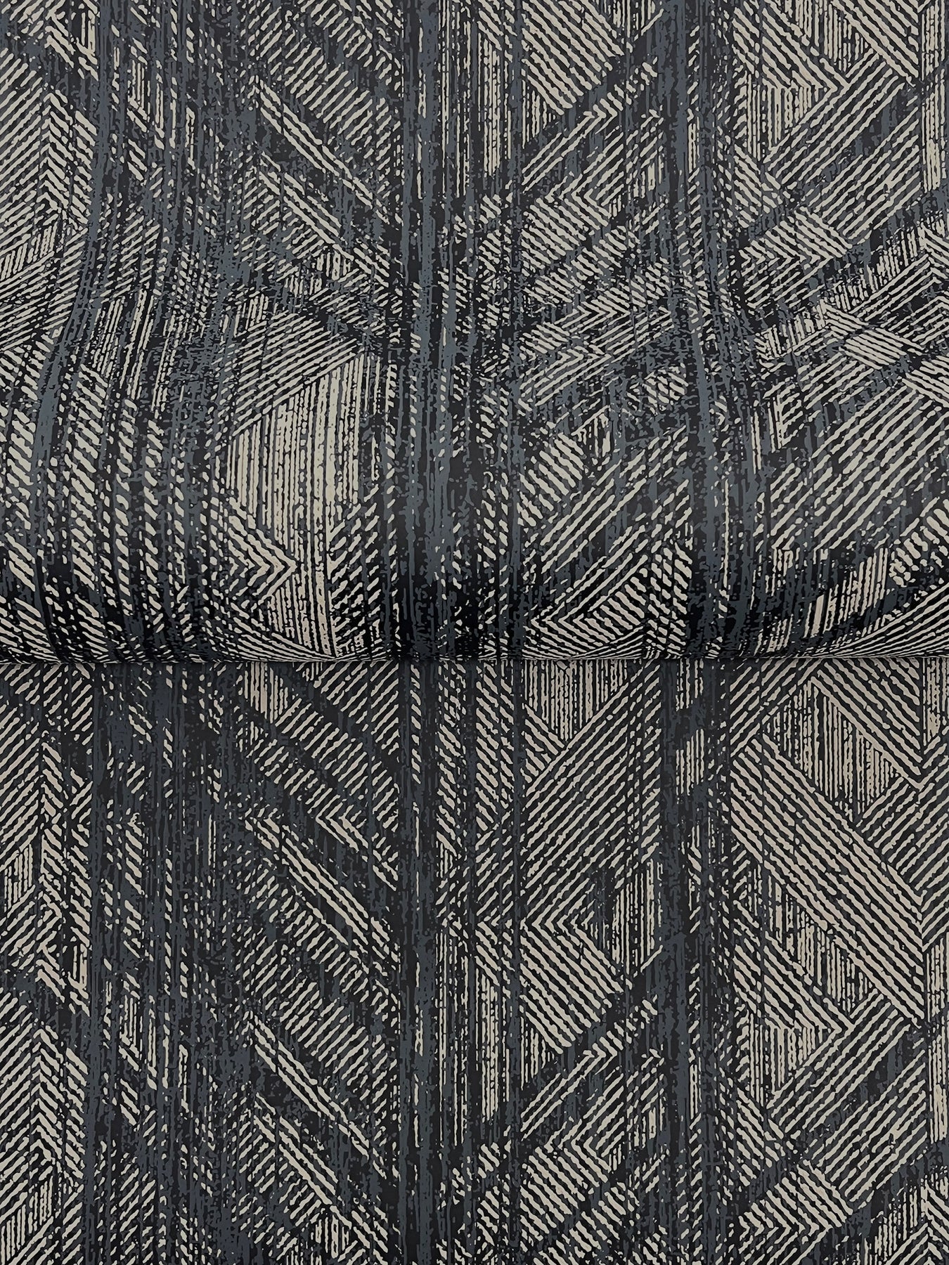 Winthrop's intricate and distressed diamond detailing bridges the gap between geometric and textural splendor. The pattern is inked in beige against a blend of steel blue and black. Winthrop is an unpasted, non woven wallpaper measuring 27 inches wide by 27 feet long, covering approximately 60.8 per roll.