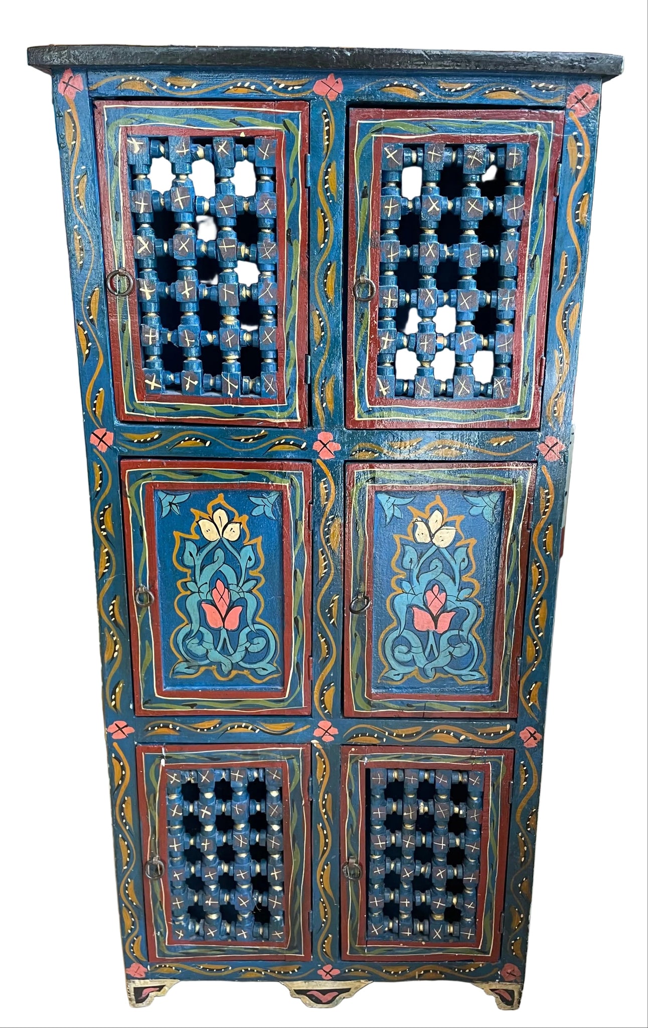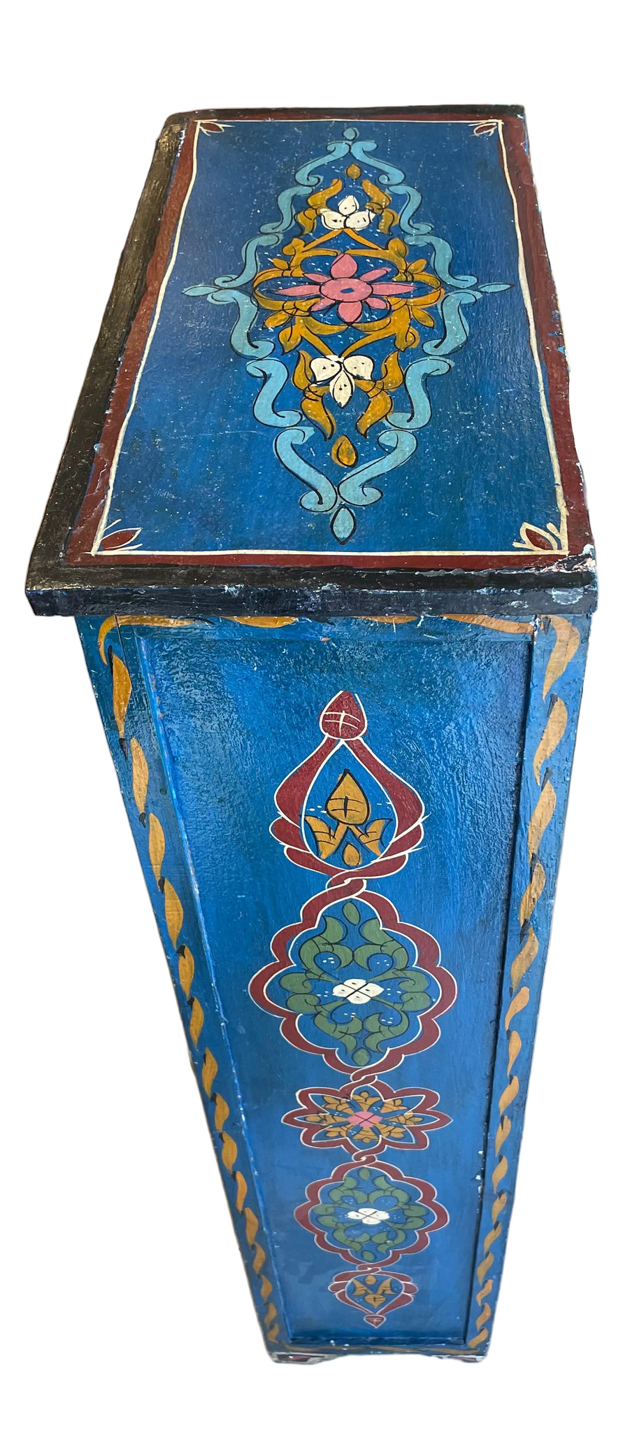 Hand painted Moroccan storage cabinet featuring intricate artisanal detailing and warm, rich tones. Dimensions: 39"H x 18.75"W x 9"D. This functional piece combines traditional craftsmanship with practical storage, offering ample space for organizing essentials while adding authentic global character to any room. Perfect for entryways, bedrooms, or living spaces seeking distinctive, handcrafted appeal.