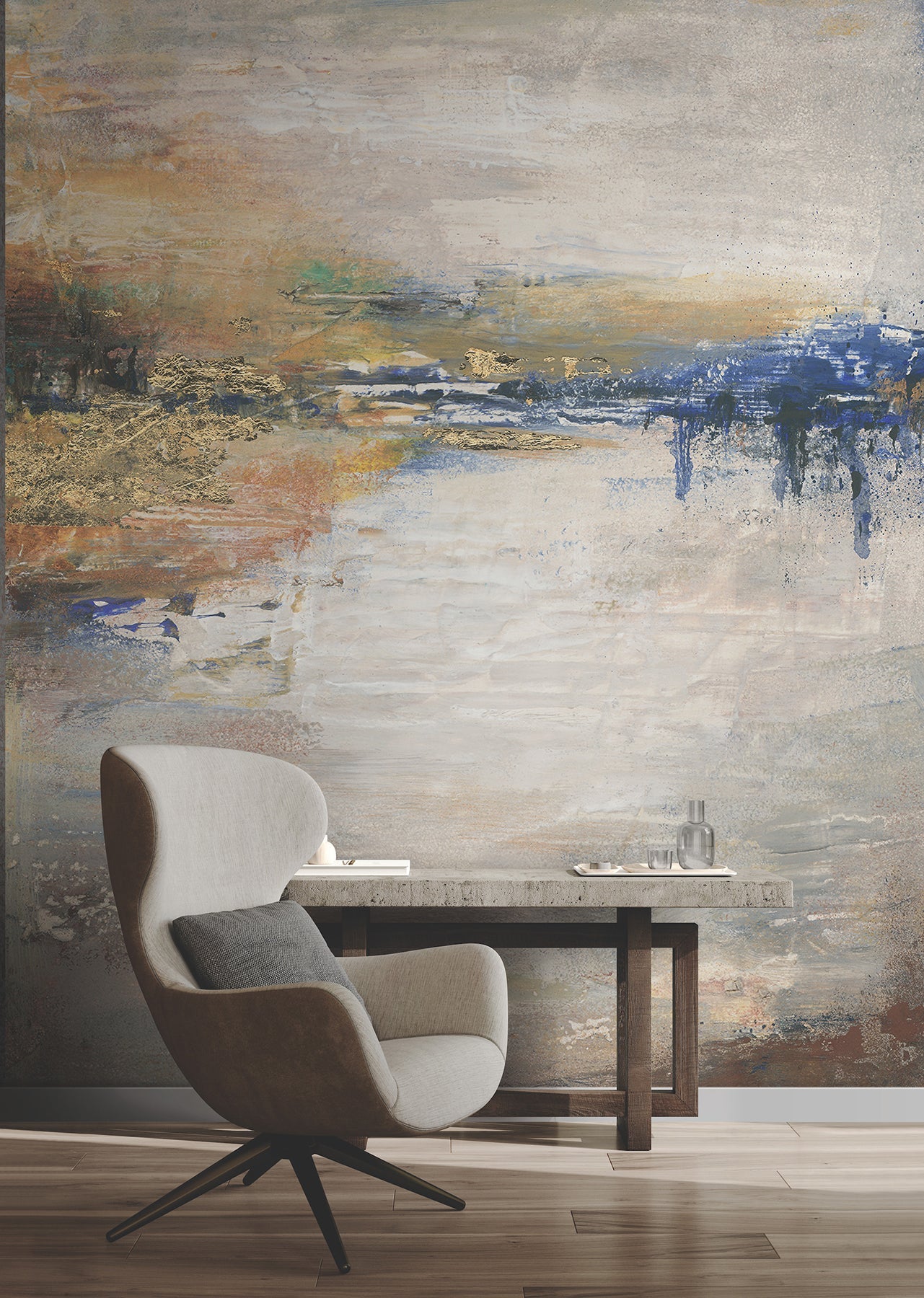 Mural Crystal Lake offers an abstract rendition of a silver lake with the sun low on the horizon. The palette is predominantly grey accented by rich blue, yellow, and orange hues. Crystal Lake Wall Mural comes on 4 panels, measuring 6-ft 11.5-in wide by 8-ft 10.3-in long when fully assembled.