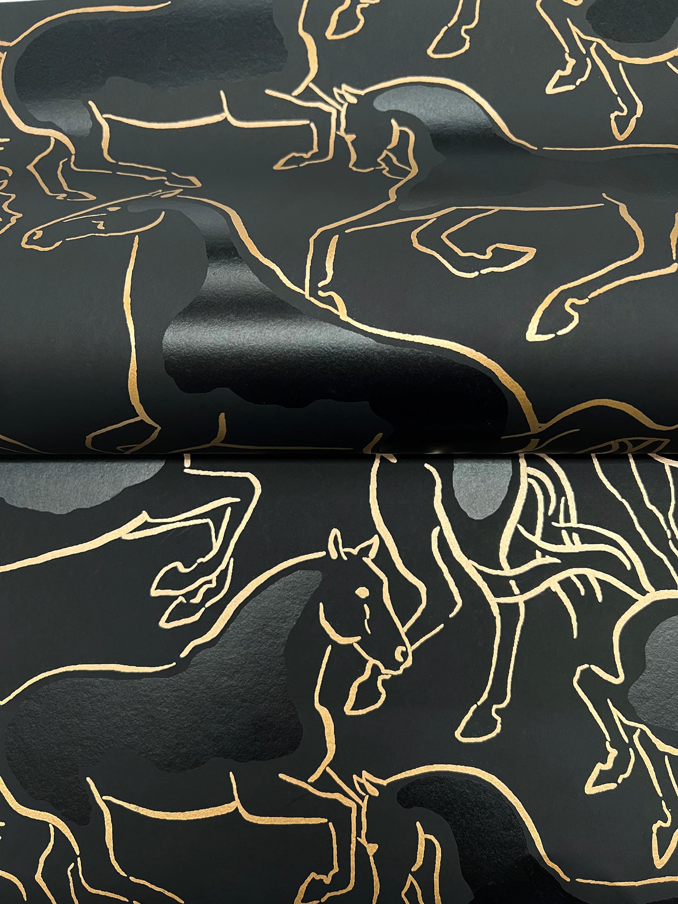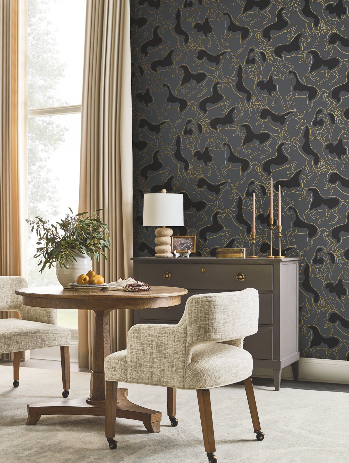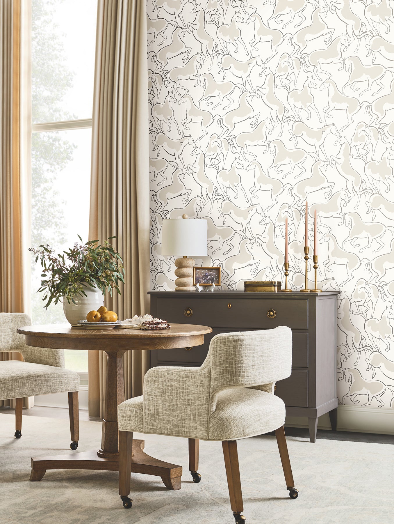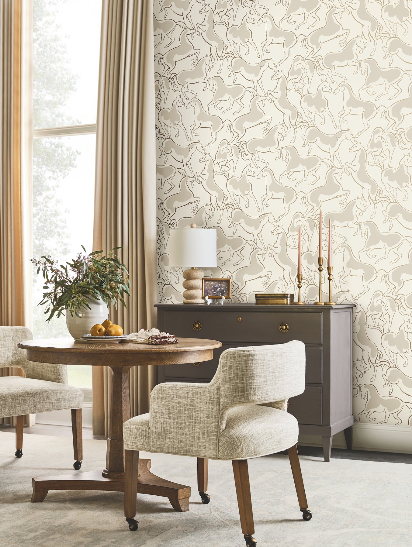 Minimalist renditions of spirited stallions rear and gallop in pattern Dressage. The horses are detailed in golden brown and taupe against a beige backdrop. Dressage is an unpasted, non woven wallpaper measuring 27 inches wide by 27 feet long, covering approximately 60.8 per roll.