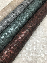 Pattern Leather Luxe is a geometric grid, overprinted with transparent, textural lacquer, for the effect of color beneath clear, shimmering waters.