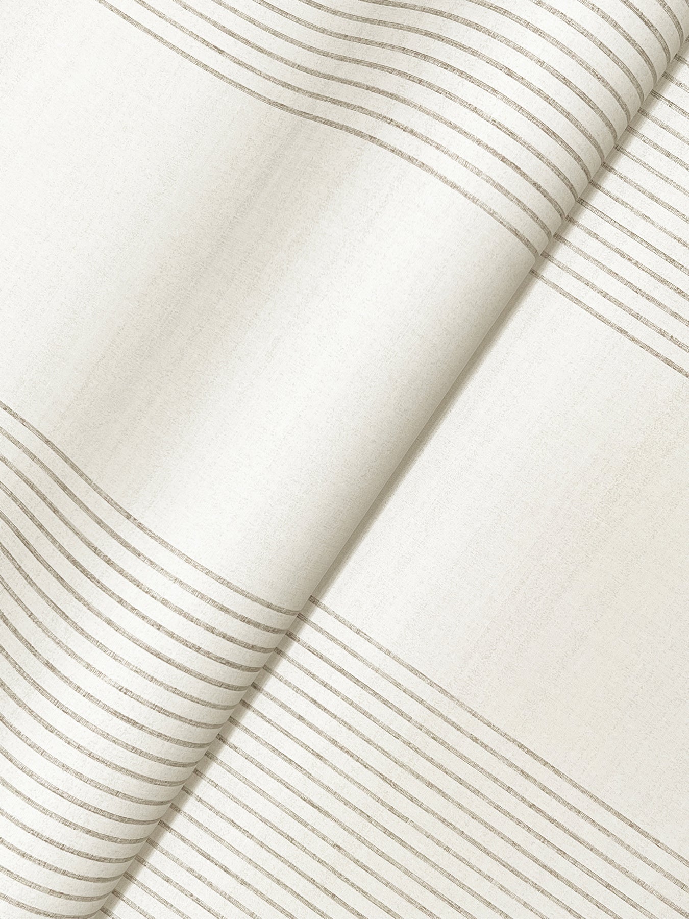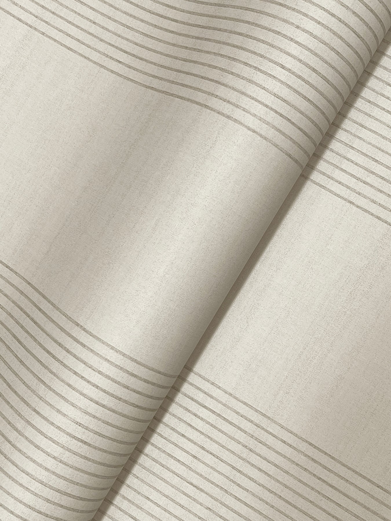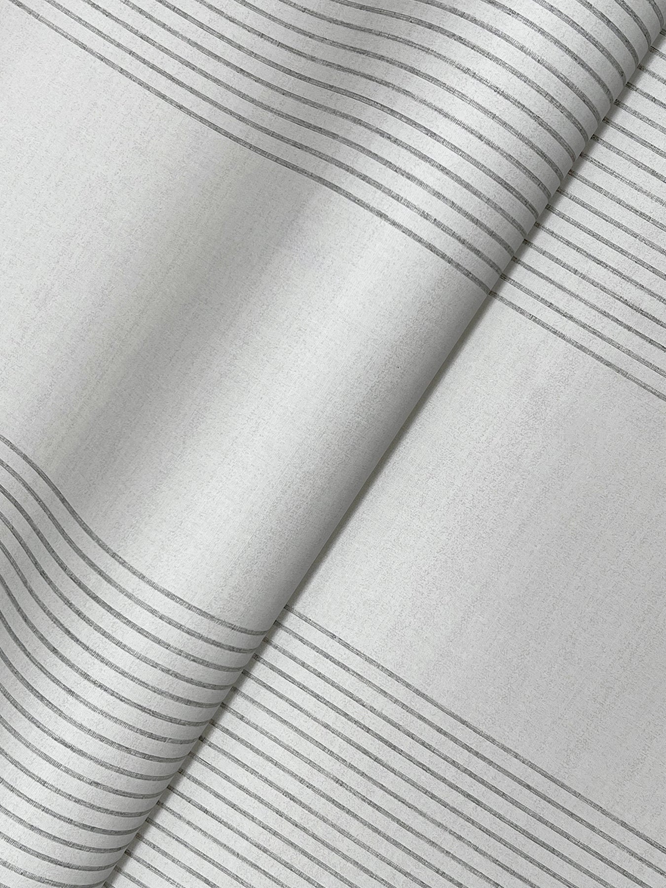 Dozens of pinstripes form wide columns evenly spaced along a backdrop imbued with fine linen detailing in pattern Archer Stripe. Featured here with grey pinstripes along a taupe background. Archer Stripe is an unpasted, non woven wallpaper measuring 27 inches wide by 27 feet long, covering approximately 60.8 per roll.