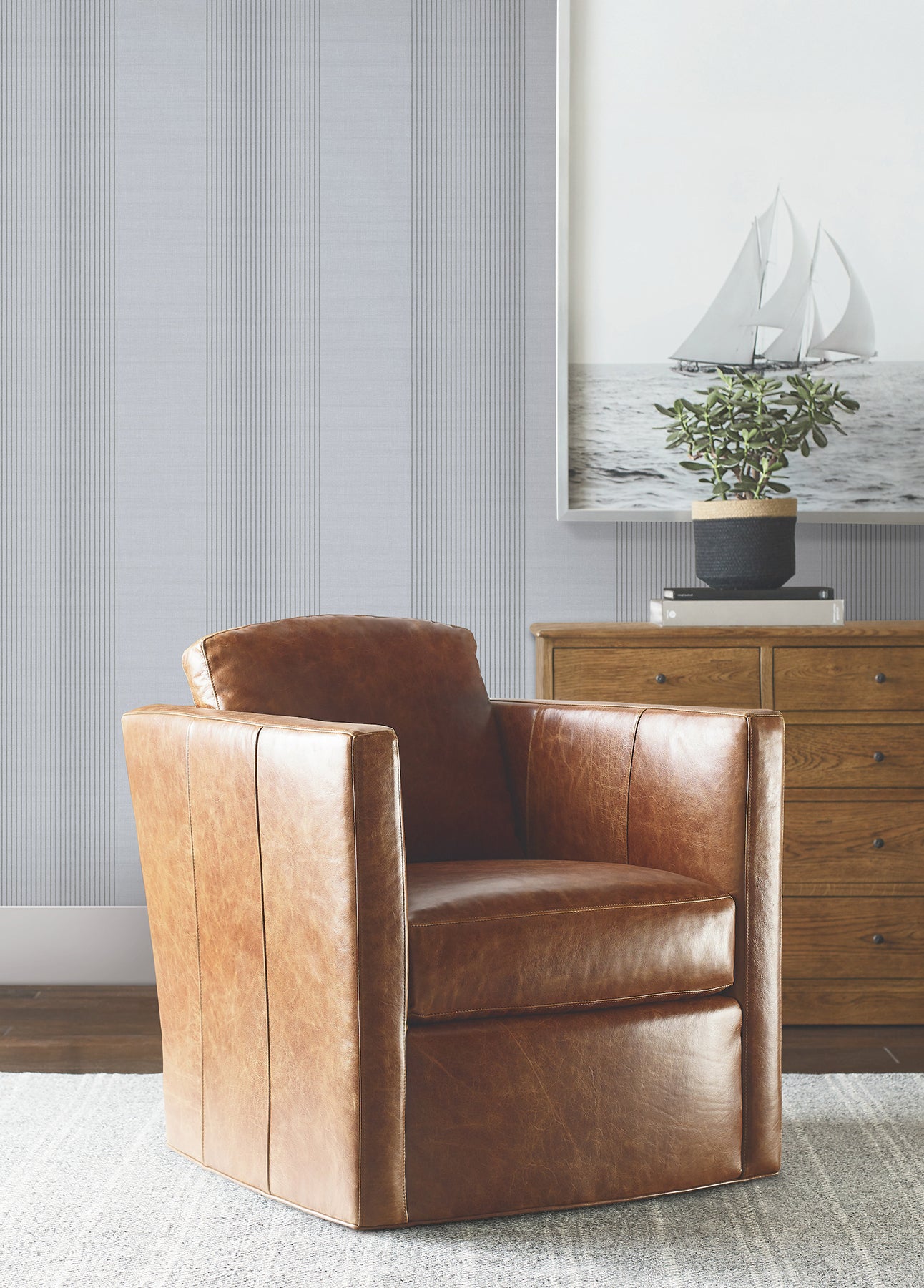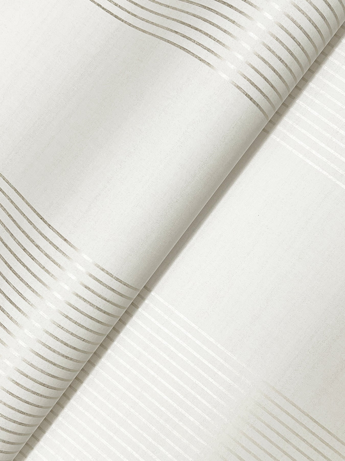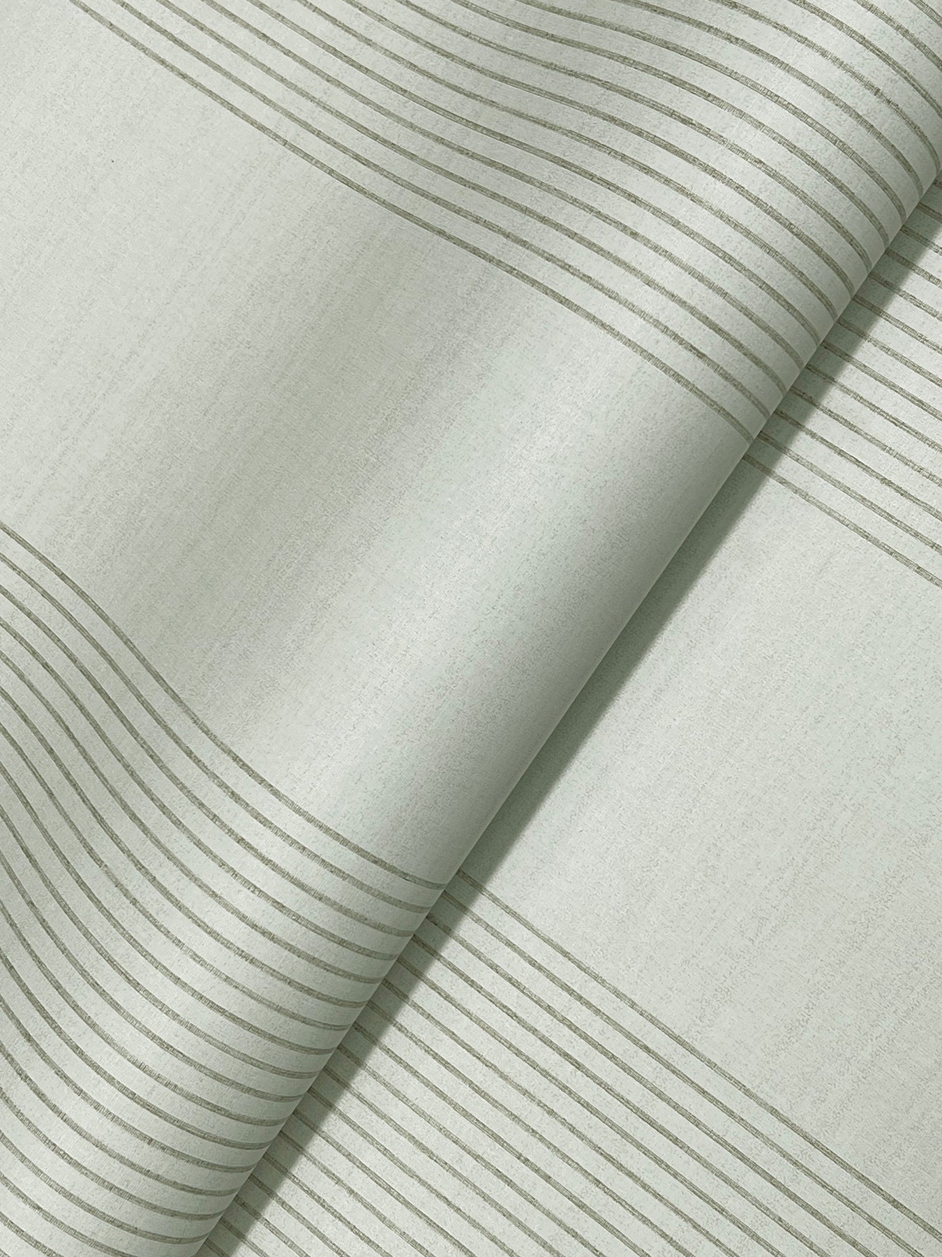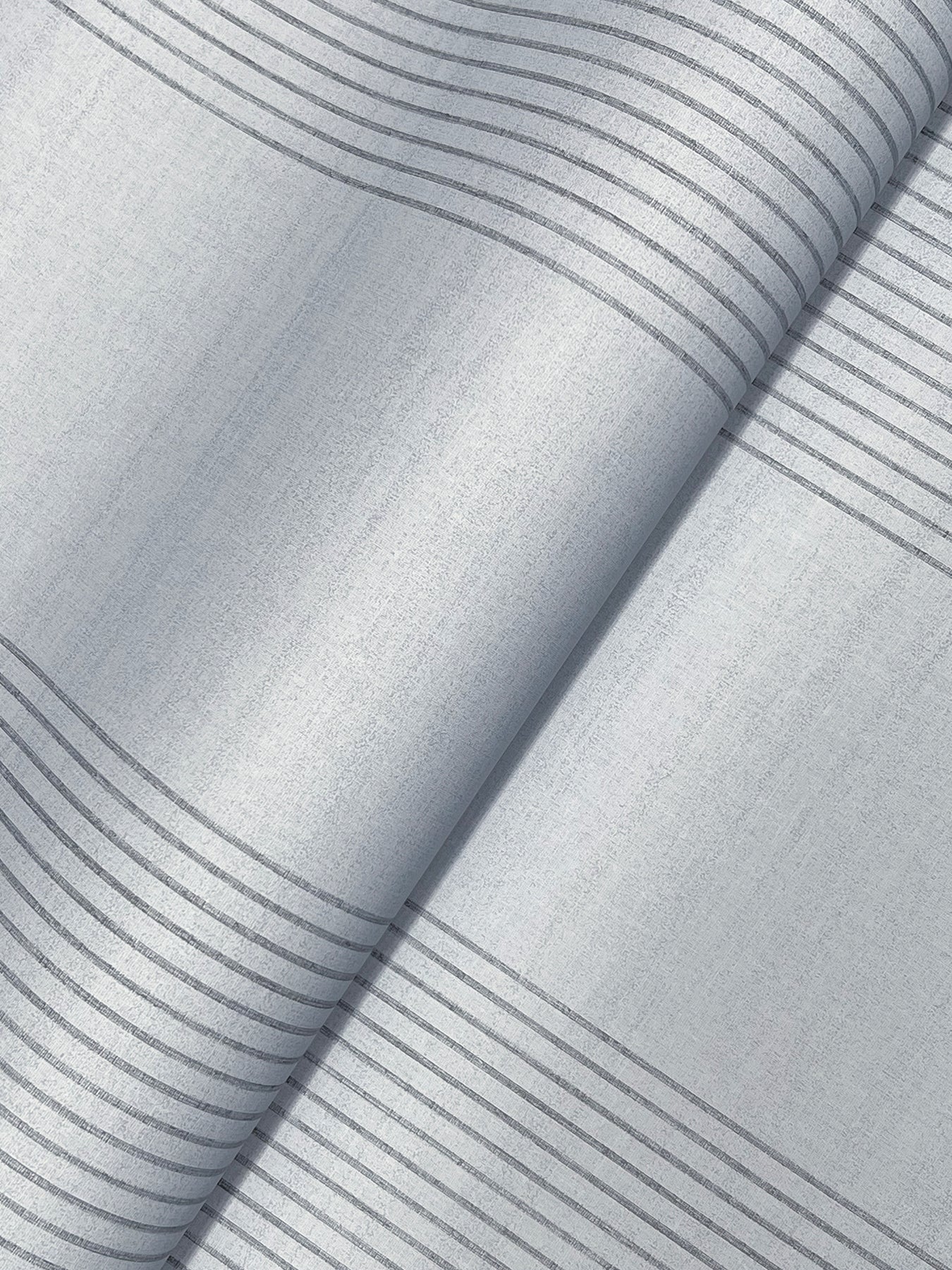 Dozens of pinstripes form wide columns evenly spaced along a backdrop imbued with fine linen detailing in pattern Archer Stripe. Featured here with grey pinstripes along a taupe background. Archer Stripe is an unpasted, non woven wallpaper measuring 27 inches wide by 27 feet long, covering approximately 60.8 per roll.