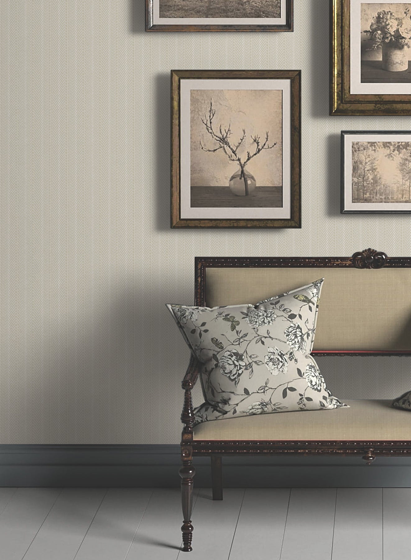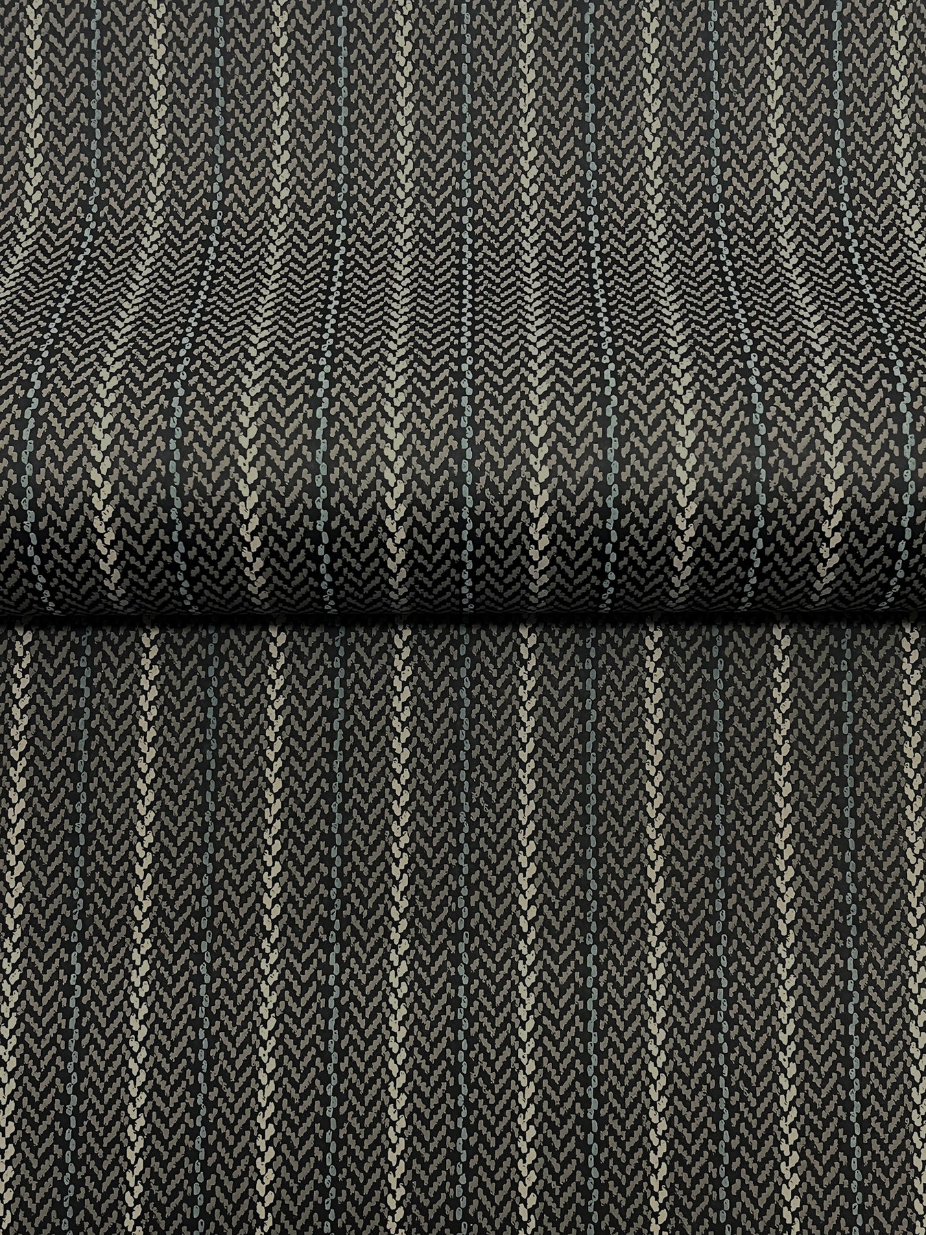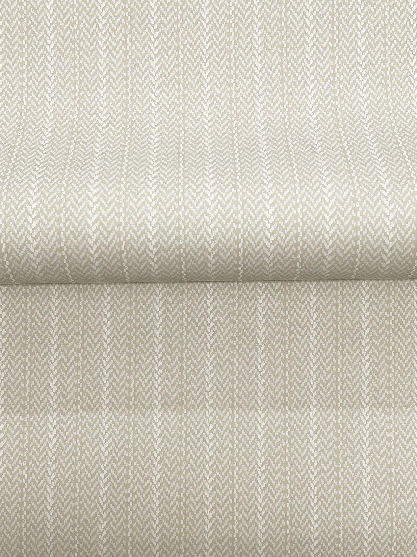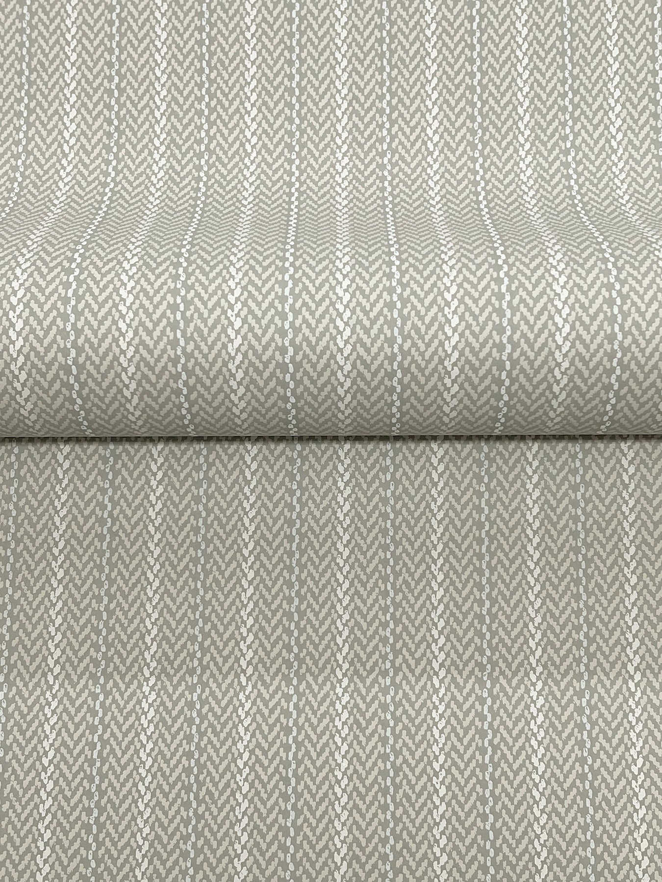 The structure of stripes meets the warmth of woven detailing in pattern Elkan Stripe. The pattern is inked in shades of beige and pale grey against a rich beige ground. Elkan Stripe is an unpasted, non woven wallpaper measuring 27 inches wide by 27 feet long, covering approximately 60.8 per roll.