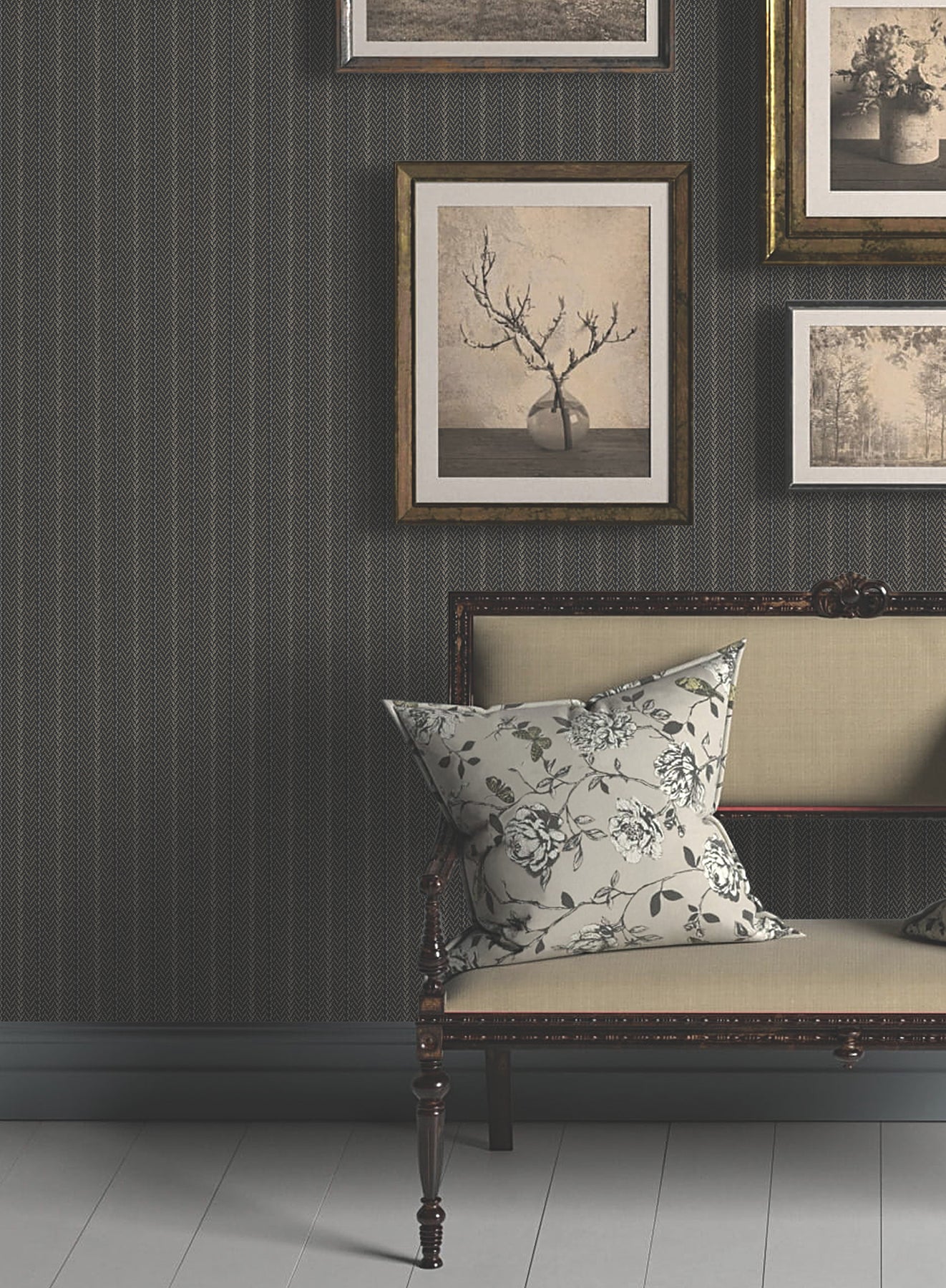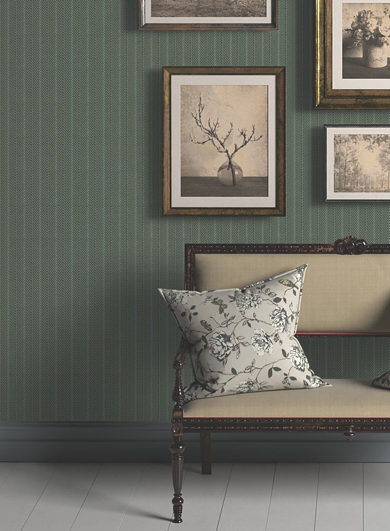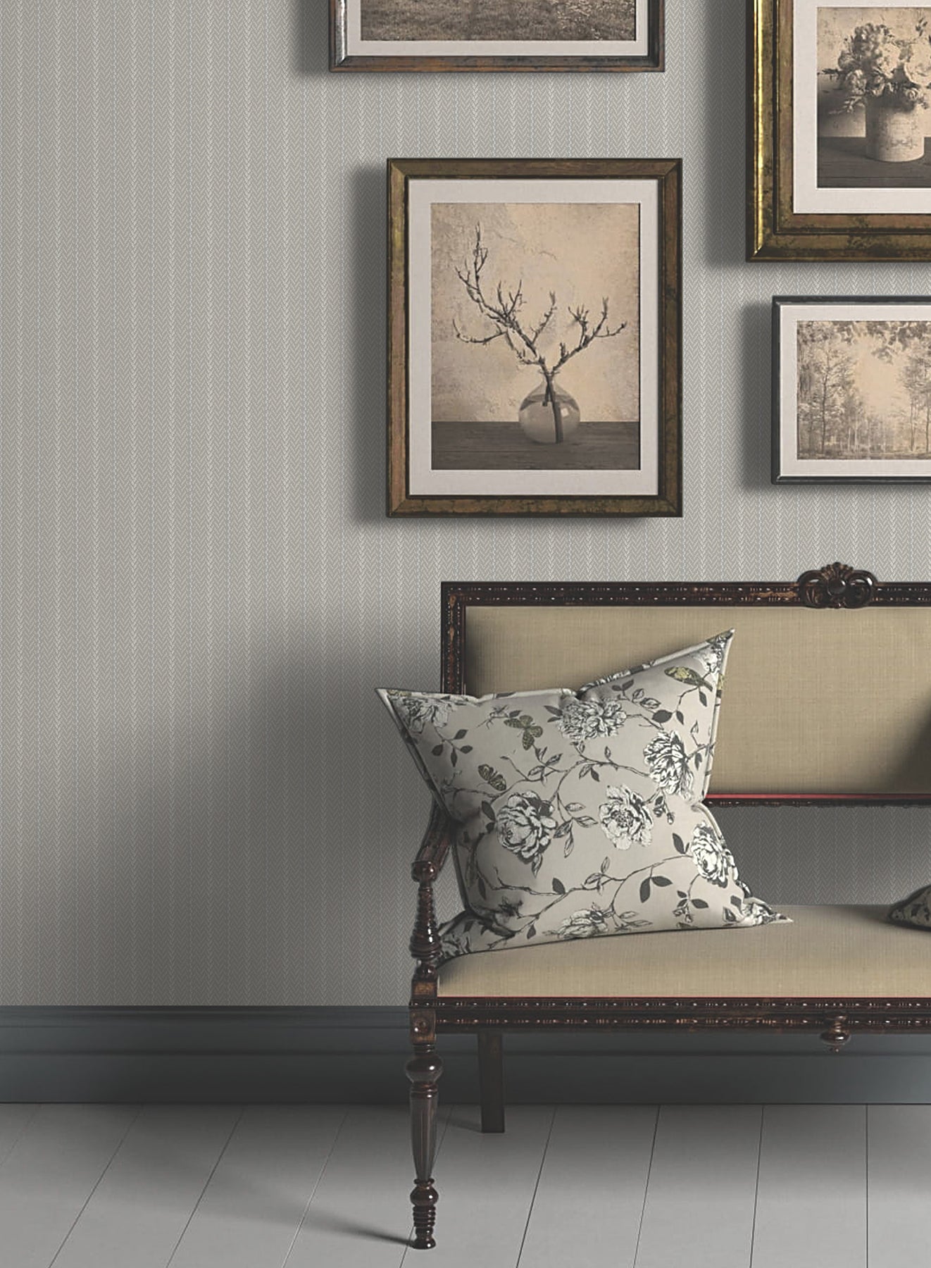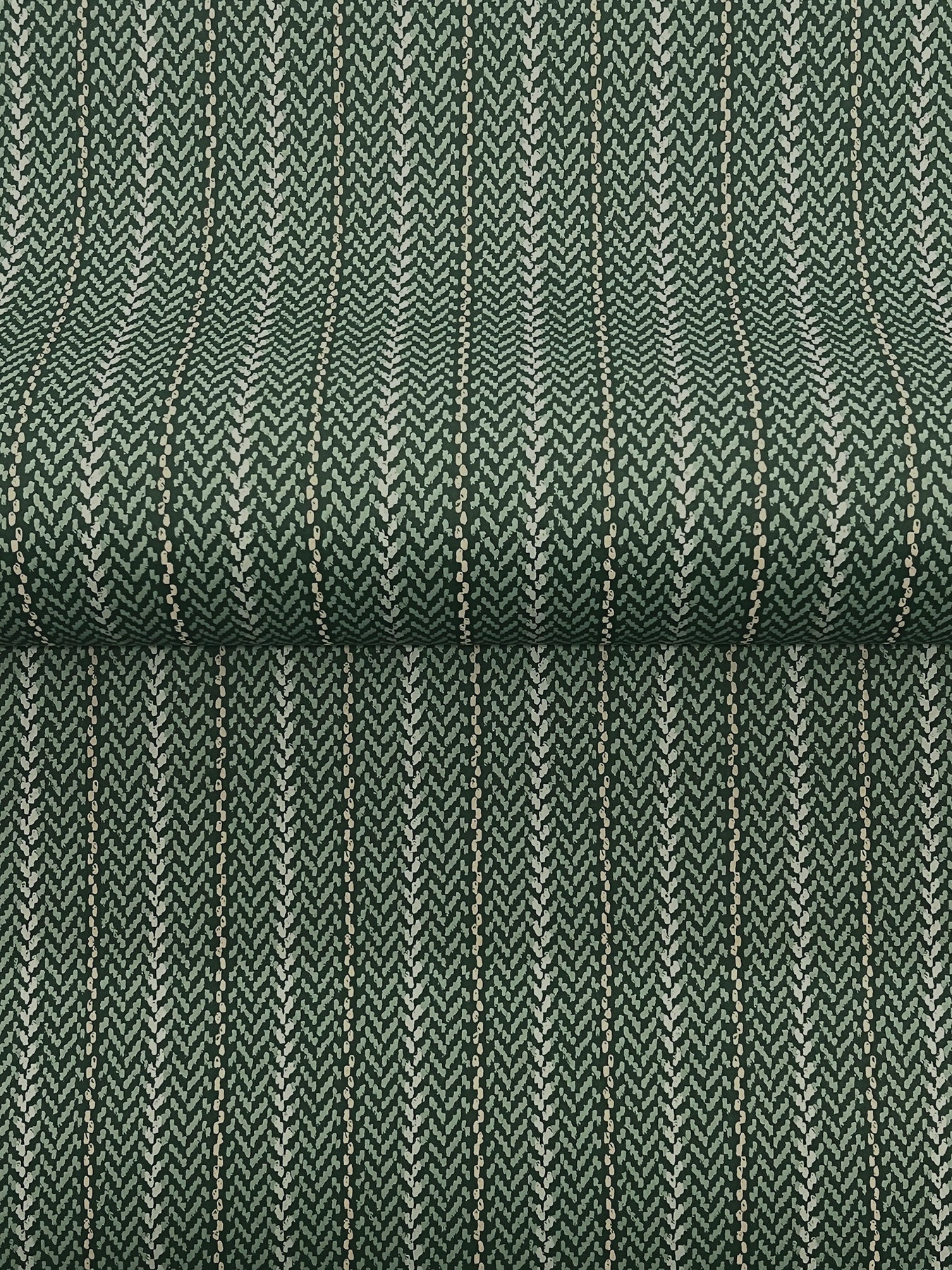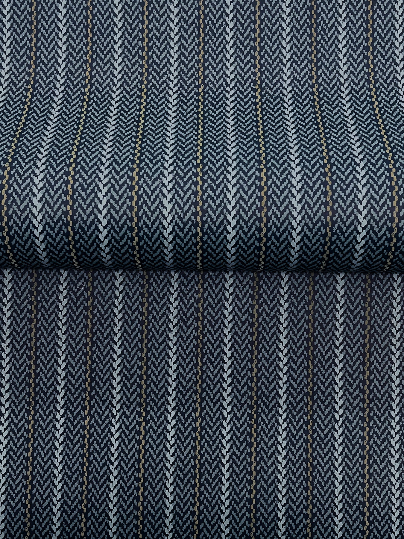 The structure of stripes meets the warmth of woven detailing in pattern Elkan Stripe. The pattern is inked in shades of beige and pale grey against a rich beige ground. Elkan Stripe is an unpasted, non woven wallpaper measuring 27 inches wide by 27 feet long, covering approximately 60.8 per roll.