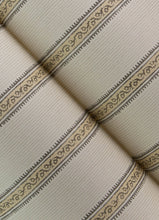 This striped wallpaper embodies the pattern's timeless appeal, with an extra embellishment of a wide sterling band etched with black climbing vines. The pinstriping is inked in beige against a cream backdrop. Mandevilla is an unpasted, non woven wallpaper measuring 20.5 inches wide by 33 feet long, covering approximately 56.4 square feet per roll.