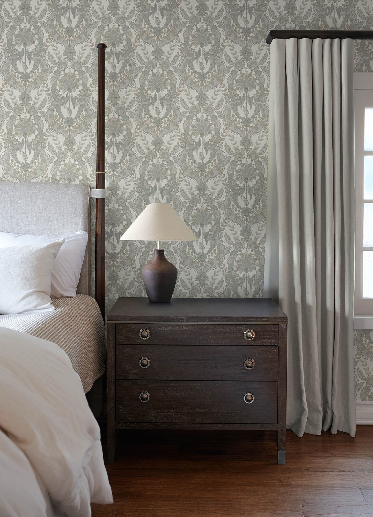 Imbued with timeless grandeur, this damask design pairs elaborate floral and botanical accents with the delicate detailing of linen. Featured here in a jewel-tone palette of teal, sapphire, topaz, spring green, beige, and charcoal. Collins is an unpasted, non woven wallpaper measuring 20.5 inches wide by 33 feet long, covering approximately About 56.4 square feet square feet per roll.