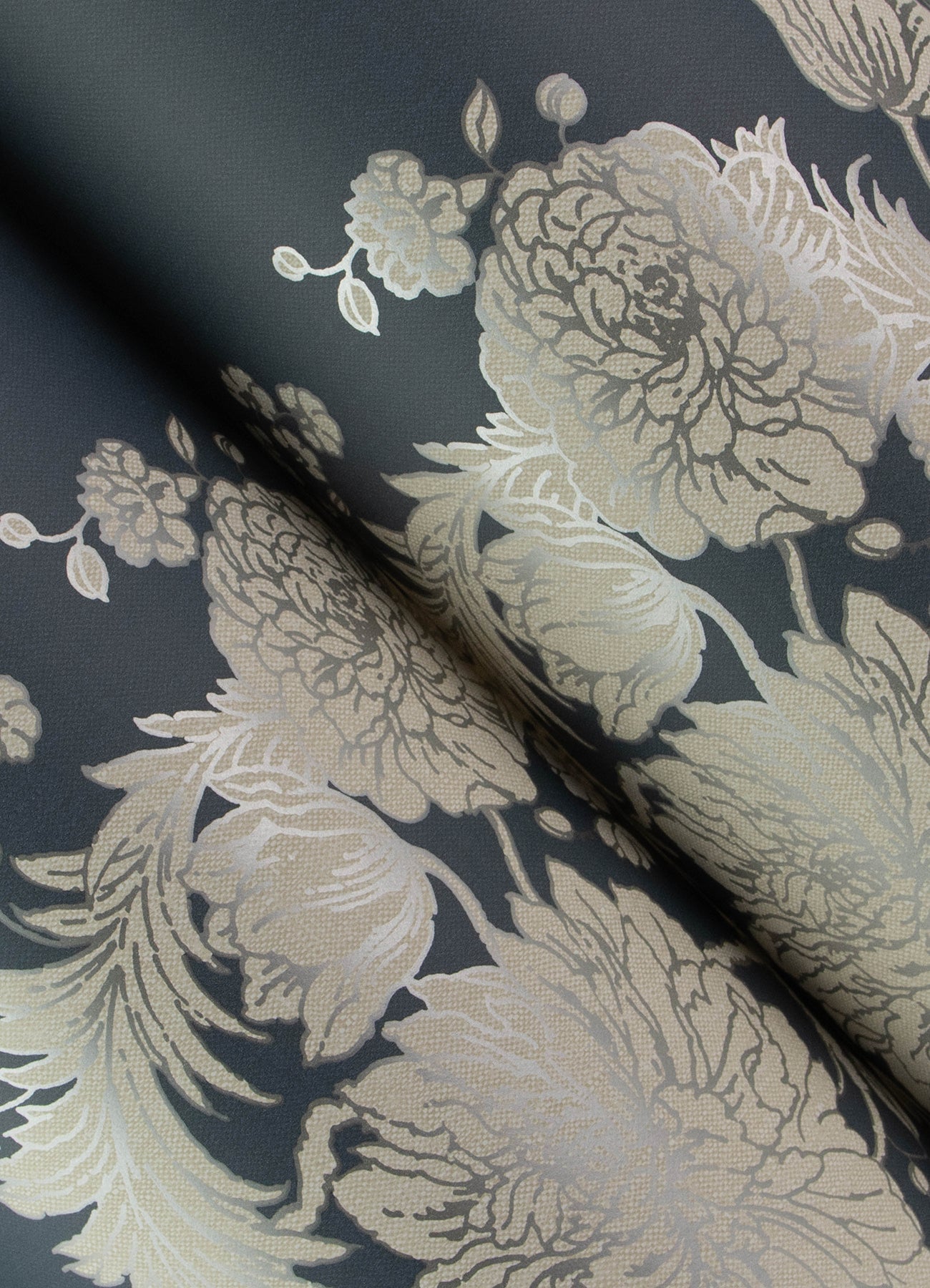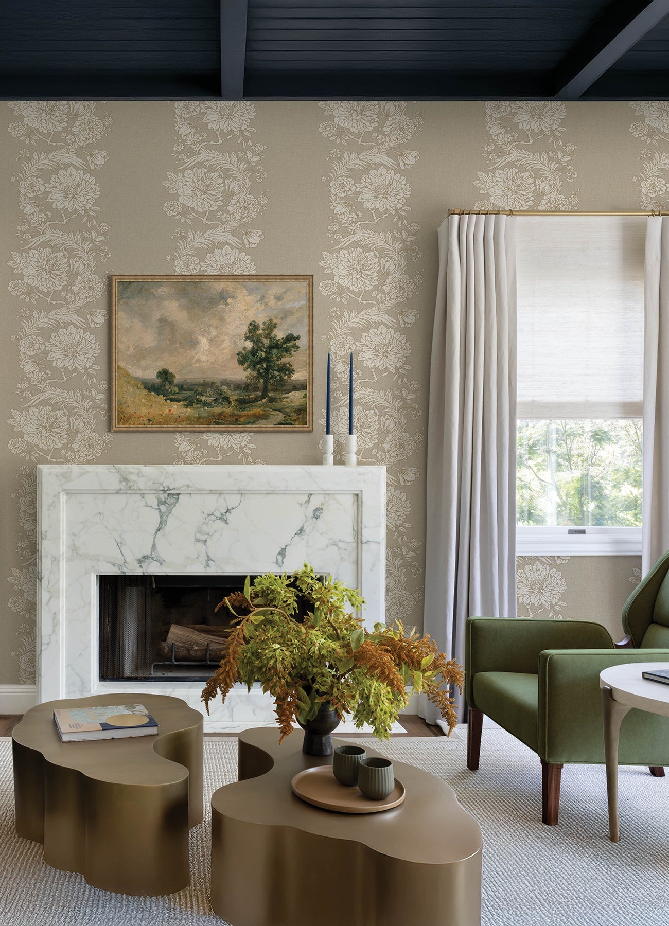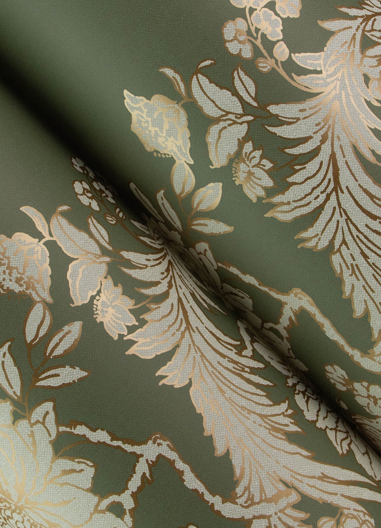 Feathery ferns twine together with voluminous blossoms to form curving columns rich in botanical beauty. The flora is inked in pale grey and metallic gold against a leafy green backdrop, the entire design enriched with linen's woven detailing. Gisela is an unpasted, non woven wallpaper measuring 20.5 inches wide by 33 feet long, covering approximately About 56.4 square feet square feet per roll.