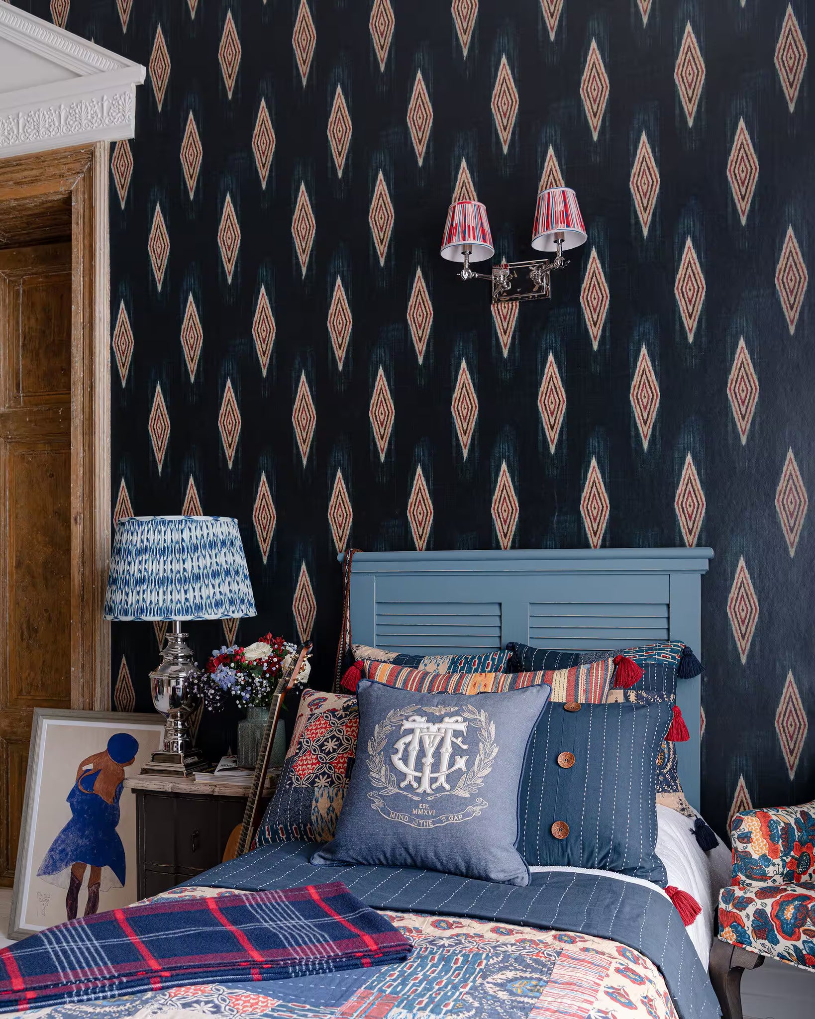 Luxuriate in the richness of hand sewn fabric with our diamond patterned MAIYSHA wallpaper which takes a painterly approach to timeless geometric shapes. Small diamonds filled with colourful echoing outlines, each layer seemingly hand sewn and celebrating the perfect imperfections of traditional textile crafts, with the overall form surrounded by organic blurs representing thread on the back of the fabric. MAIYSHA was especially created to complement wallpapers from the free-spirited WOODSTOCK Designer collection and makes for a great standalone statement piece too.