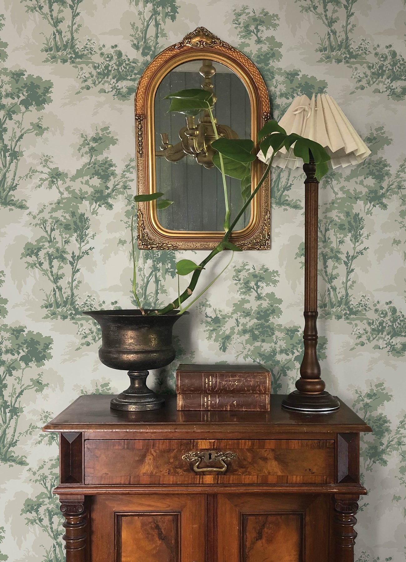 With its roots in archival design, this scenic forest wallpaper balances Old World grandeur with modern timelessness. Seen here in a palette of sage, moss, beige, and white. Sainsbury is an unpasted, non woven wallpaper measuring 27 inches wide by 27 feet long, covering approximately About 60.8 square feet square feet per roll.