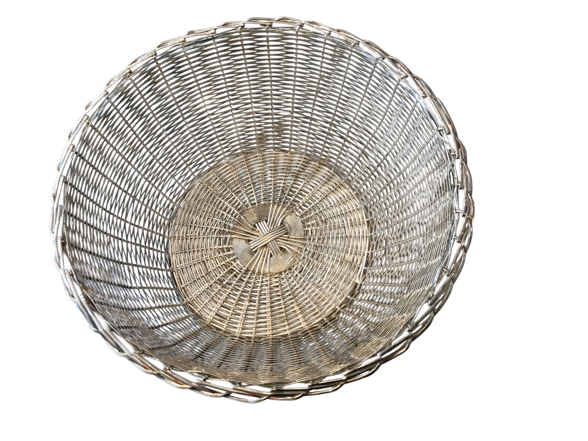 Elevate your home decor with our sleek Silver Basket! Perfect for storing your favorite trinkets or displaying fresh flowers, its round shape and sturdy construction make it a versatile addition to any space. Measuring 9 inches in diameter and 4 1/2 inches in height, this woven basket adds a touch of sophistication while keeping your essentials organized.